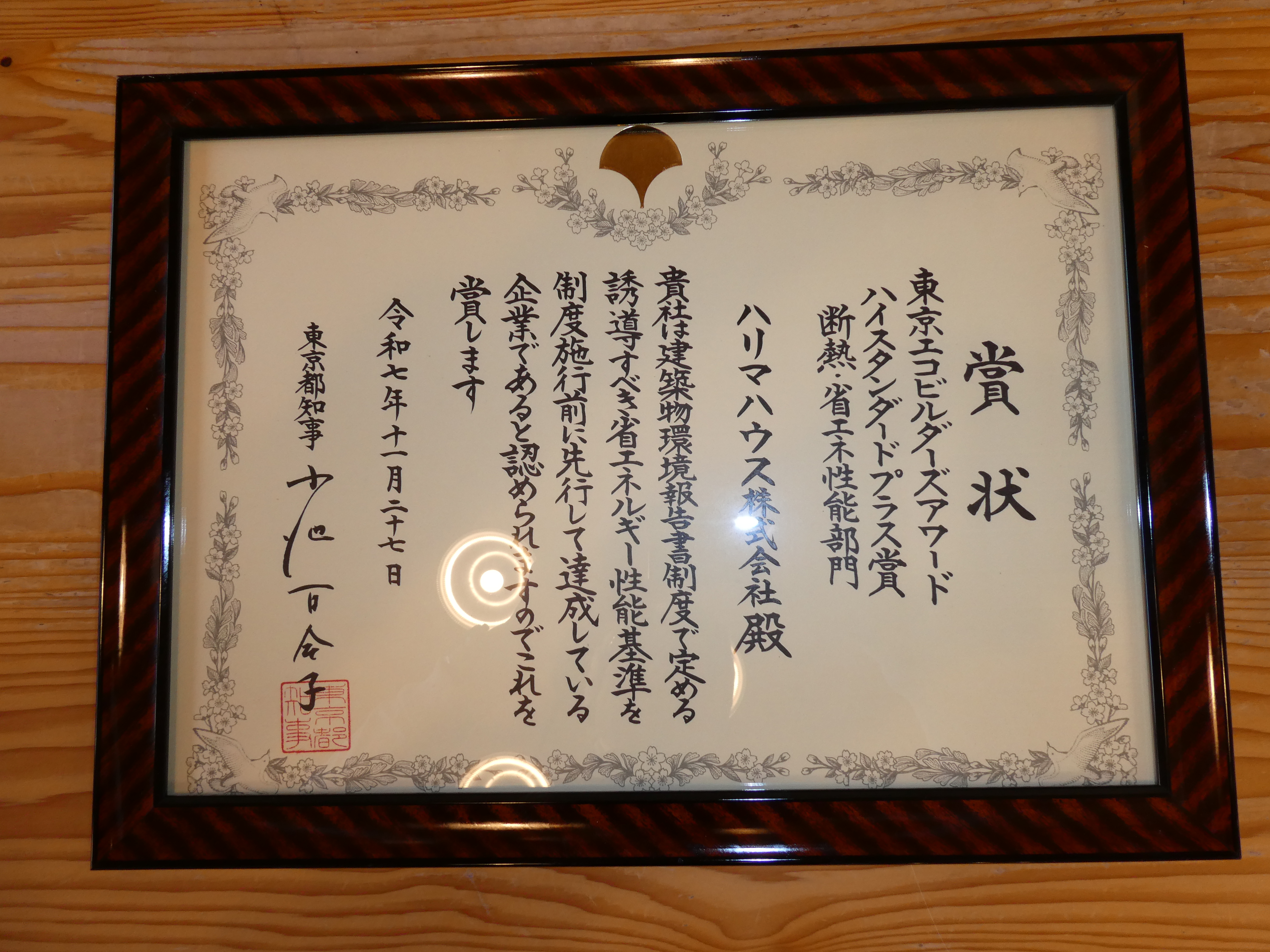 東京都主催のエコビルダーズアワード は、 環境性能の高い建築物の普及に取り組む意欲的な事業者を表彰し、優良事例等の共有、都民への情報発信等を通じて、建築物脱炭素化に向けた意識醸成を図ることを目的とするものです。 東京都の関係者から弊社に応募するよう連絡を頂き、令和7年11月、エコビルダーズアワード、ハイスタンダードプラス賞を受賞しました。これを励みに、環境性能のより高い建築物の普及に取り組んで参ります。