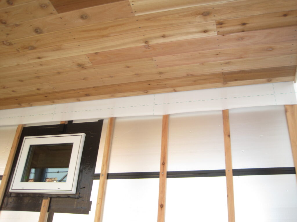 外張り断熱材アキレスQ1ボードを屋根100㎜、壁50㎜貼っています。