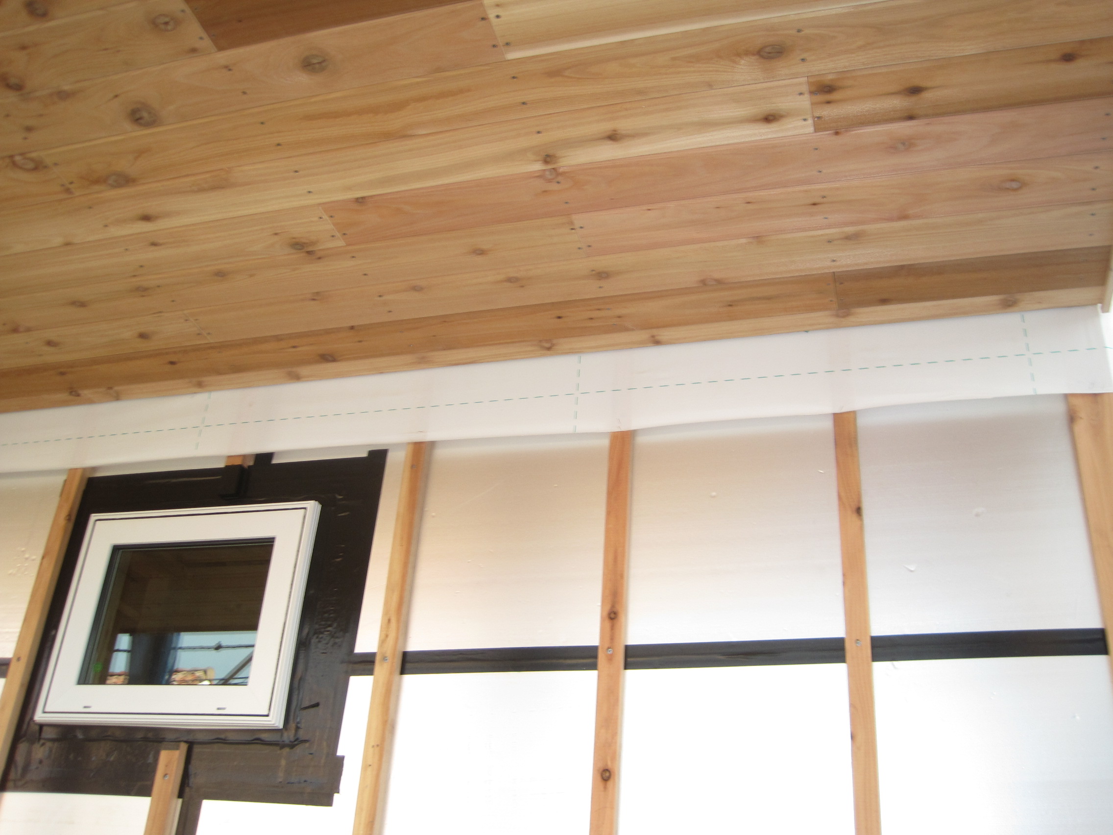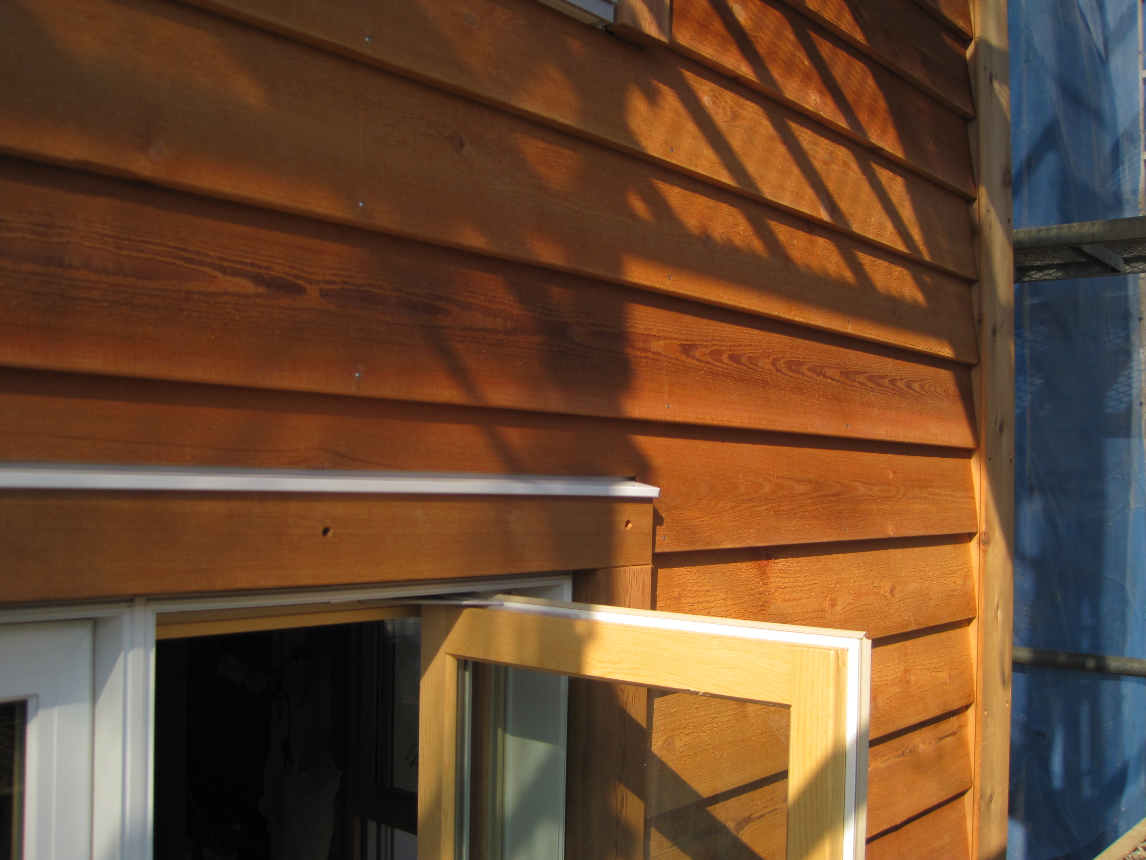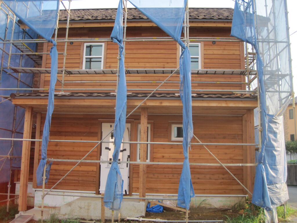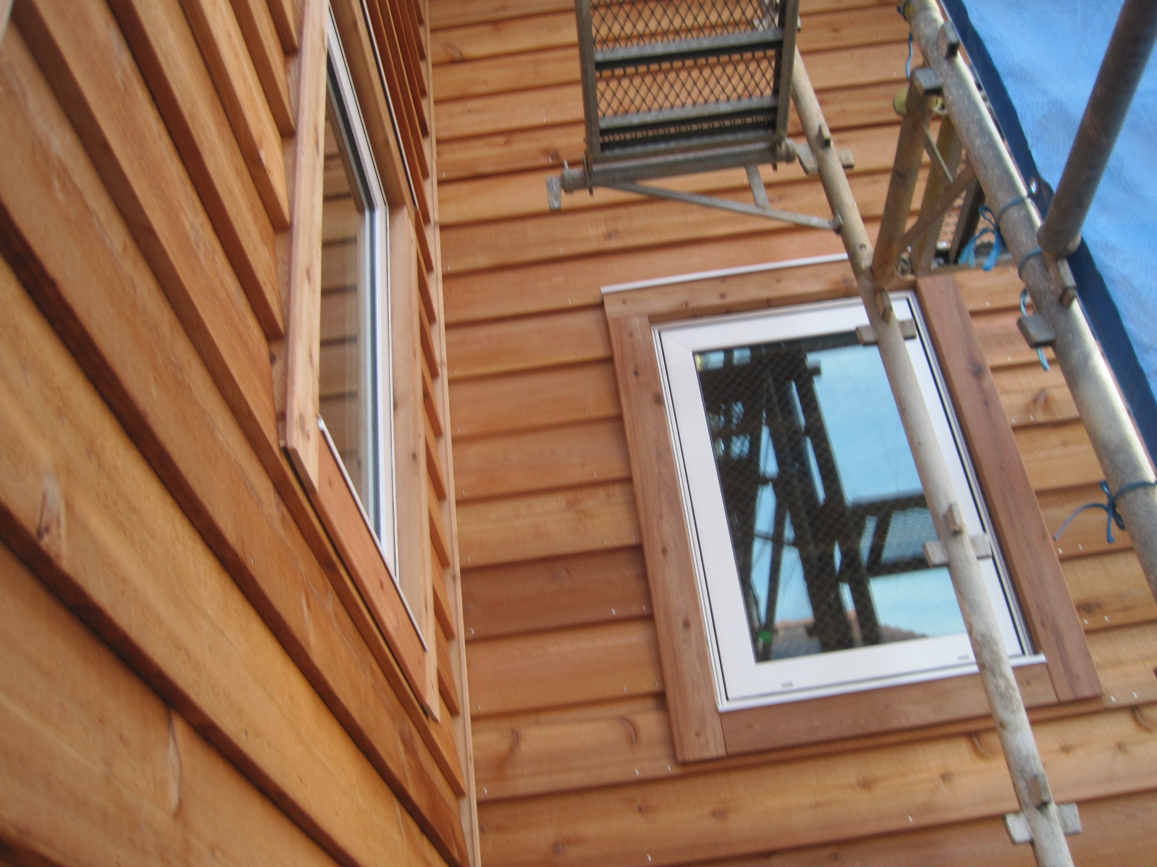 木製サイディングを貼り始めました。木製サッシと木製サイディングの組合せはやはり良いですね。