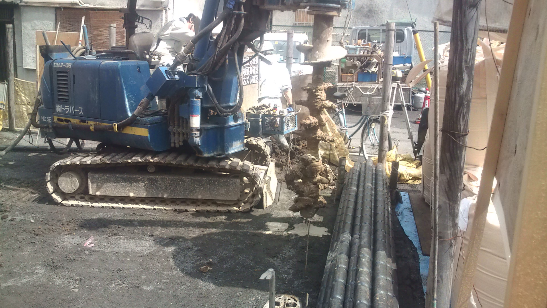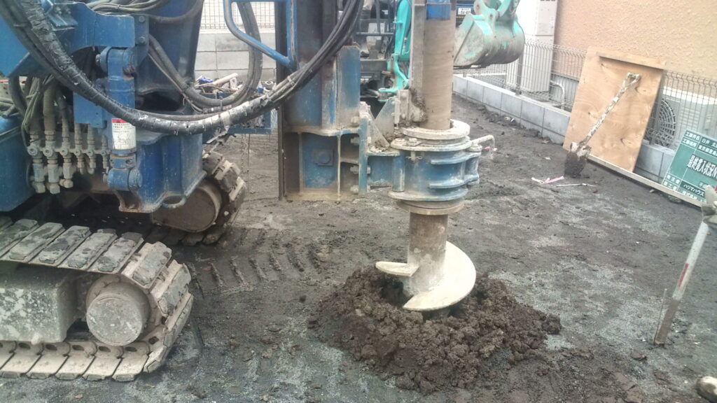 地盤改良工事を行いました。このあたりは支持層までの深さが5mあり、鋼管心材を持つソイルセメントコラム工法で行いました。