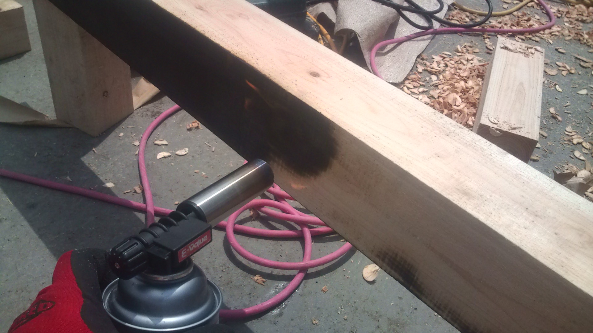 土台を敷きました。土台は桧の芯持ち材を使用しています。防蟻、防腐処理は表面をバーナーで焙り炭化させます。ノンケミカルなのと、炭を塗るよりも効果は半永久的に持続します。側面に貼っている青いものは、蓄熱層の断熱材です。