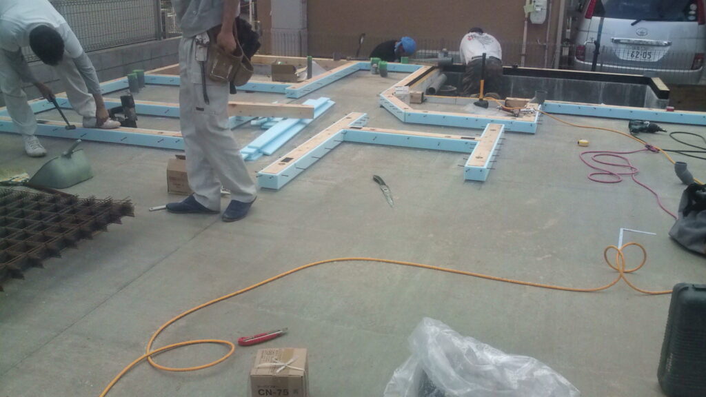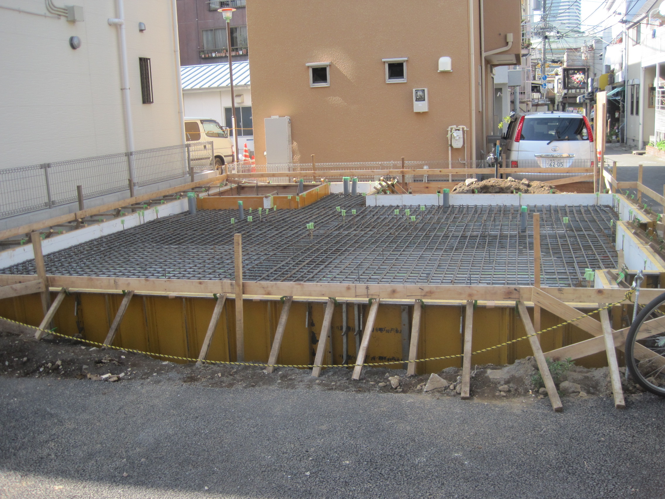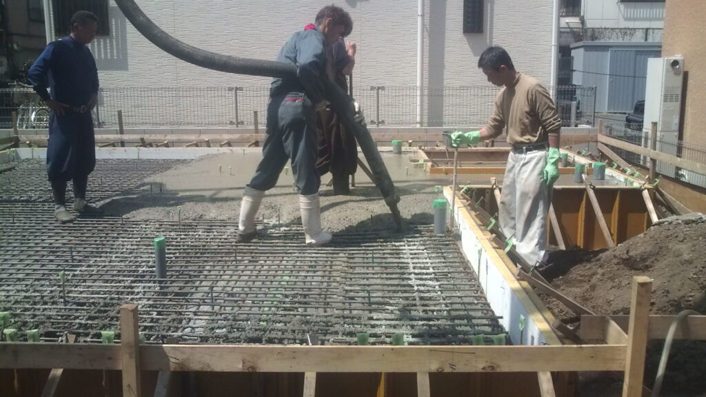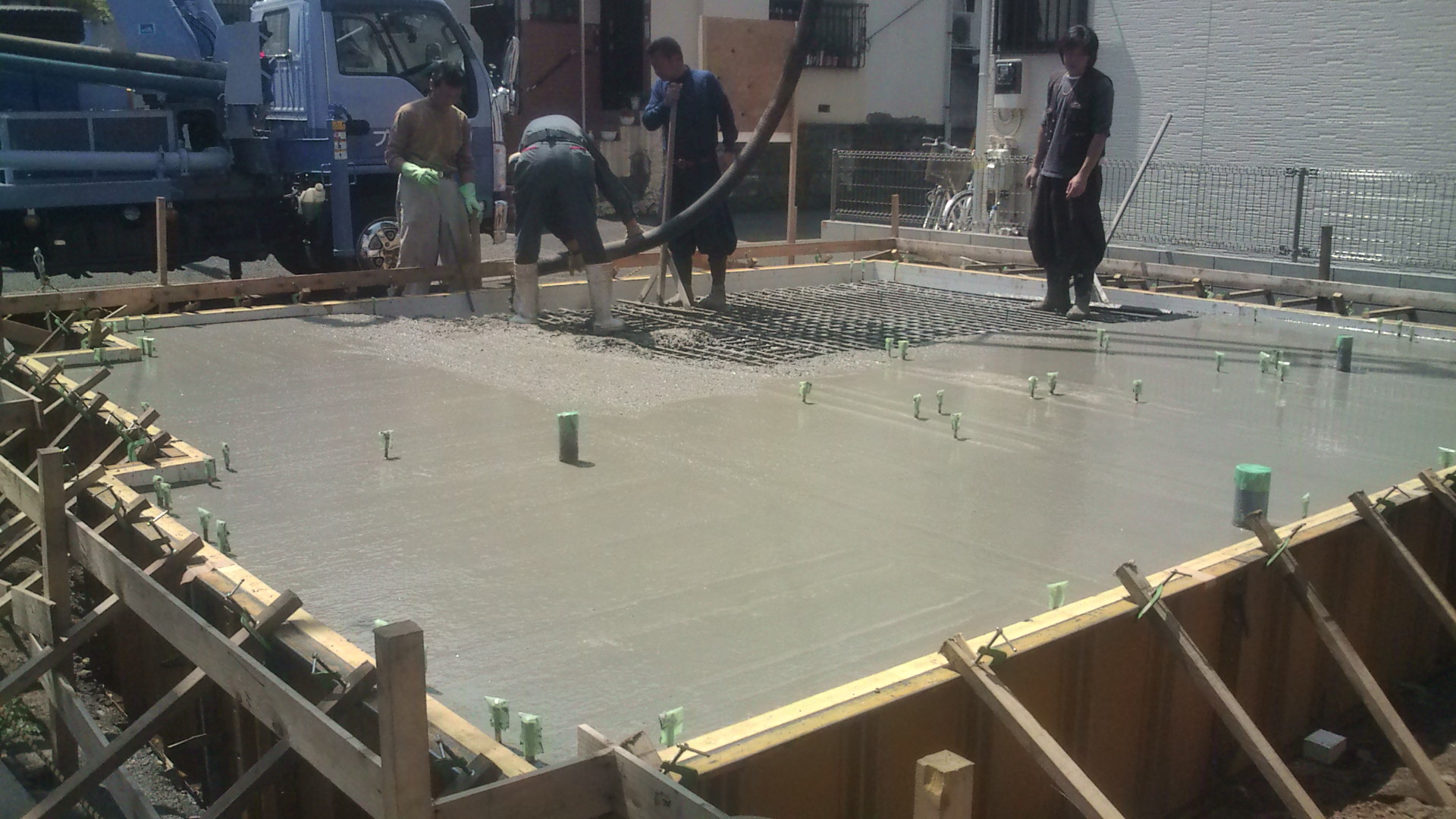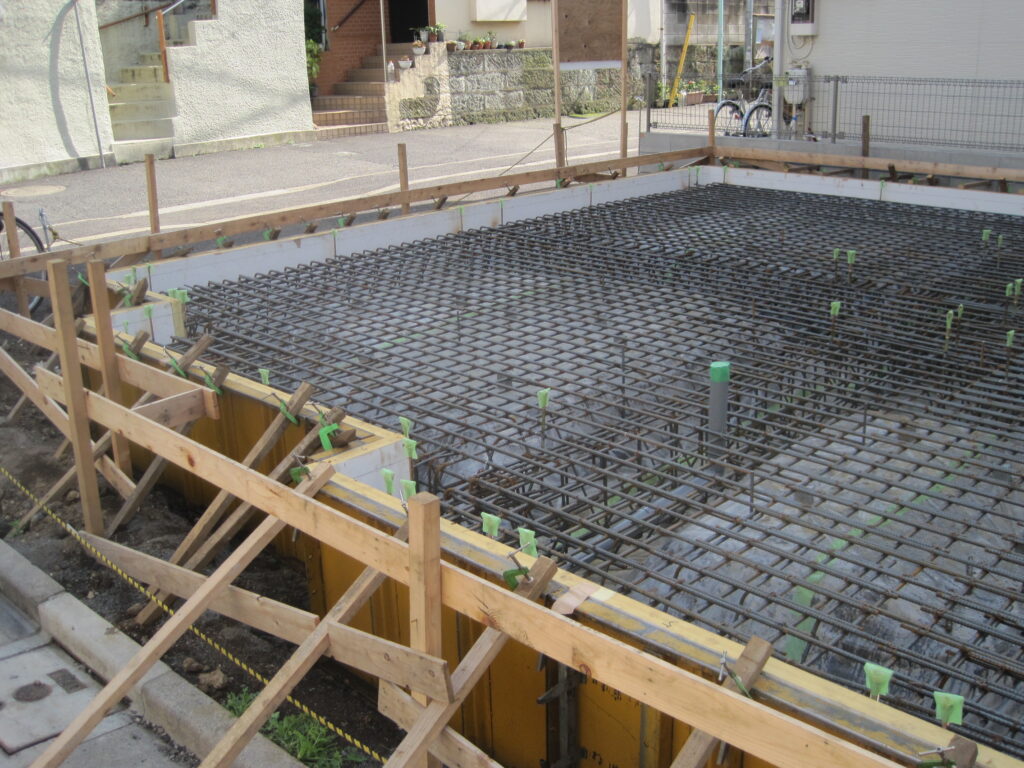 基礎のコンクリートを打設しました。土間床基礎は打ち継ぎのない一体の鉄筋コンクリート造で構造上有利に働きます。ゴールデンウイーク中は養生期間です。
