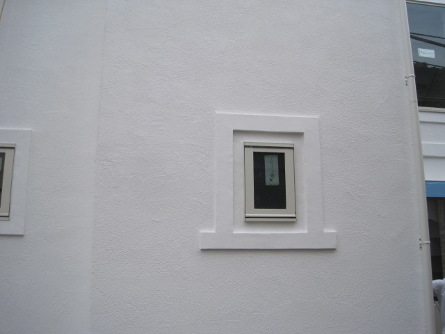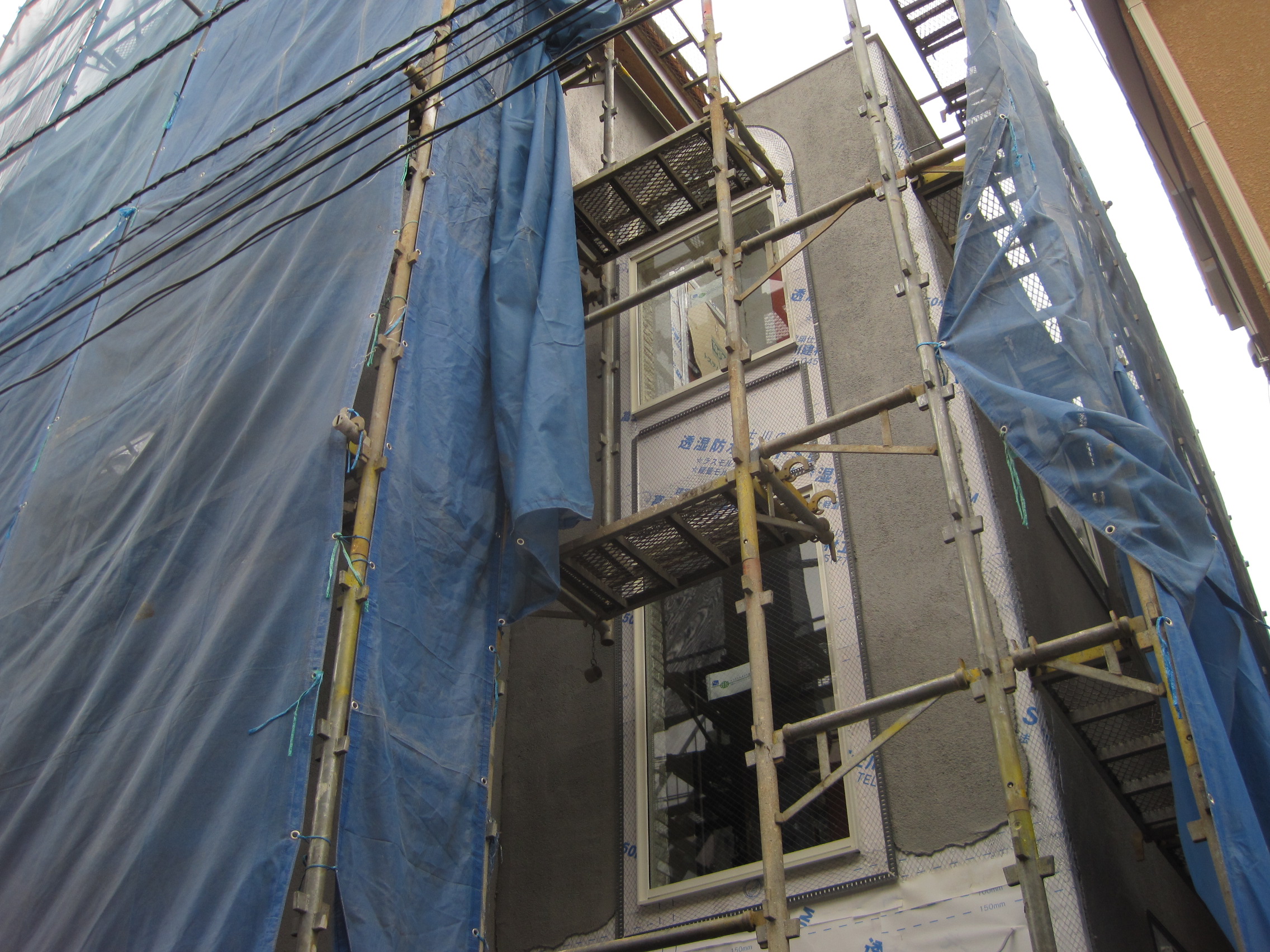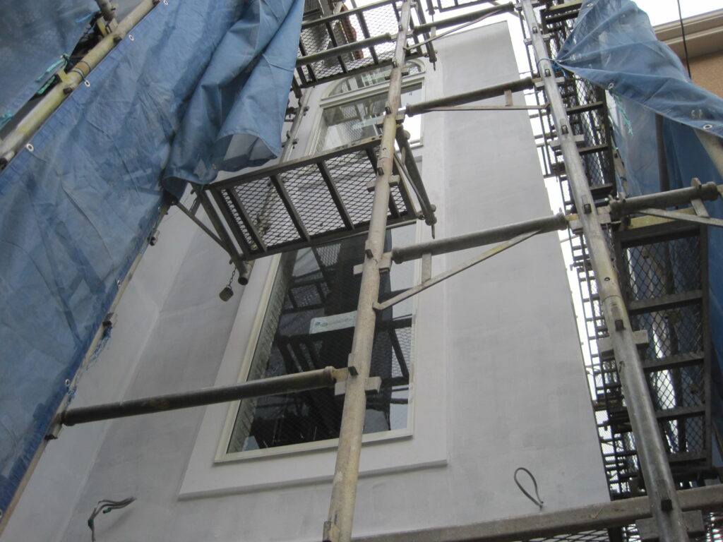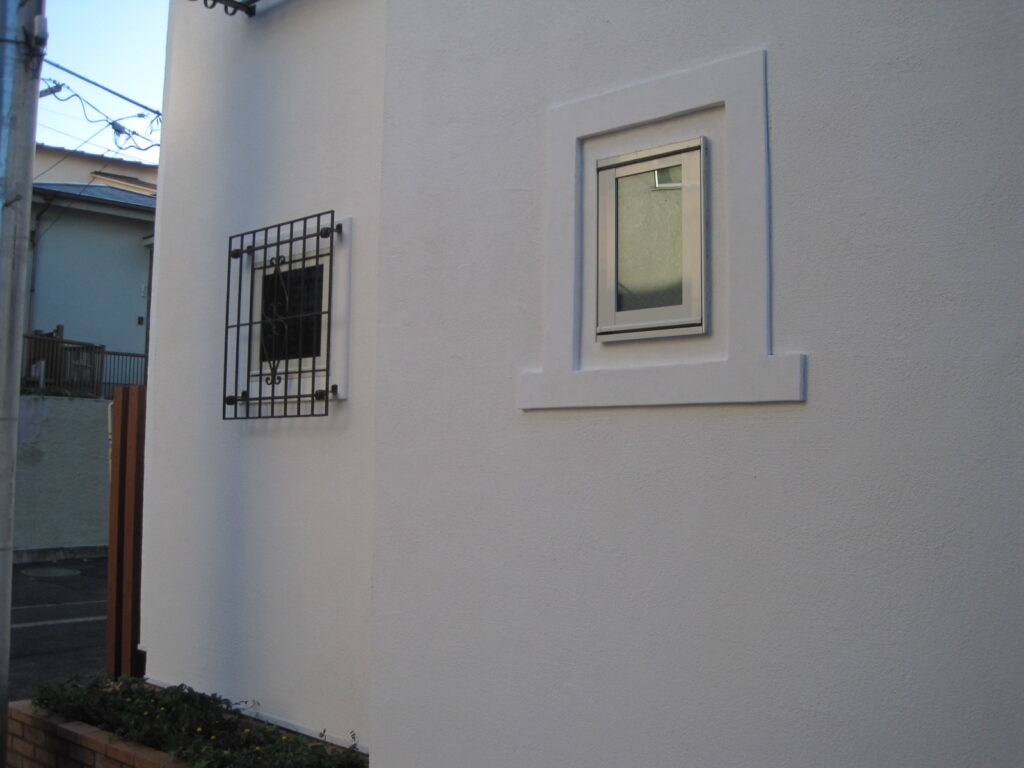 1階の目隠しが出来上がりました。青空は漆喰の白を際立たせます。