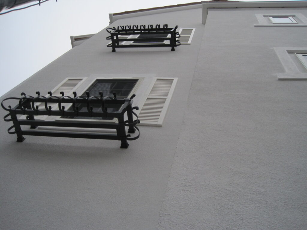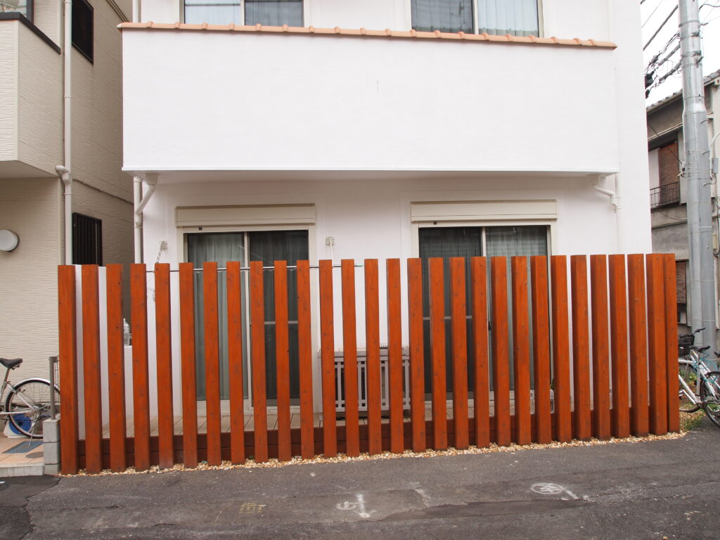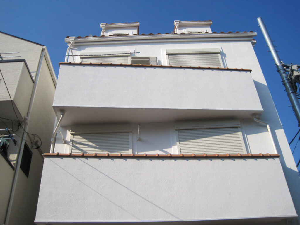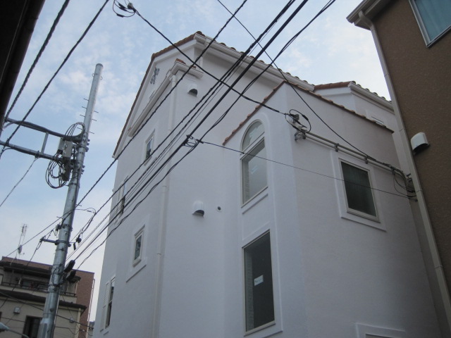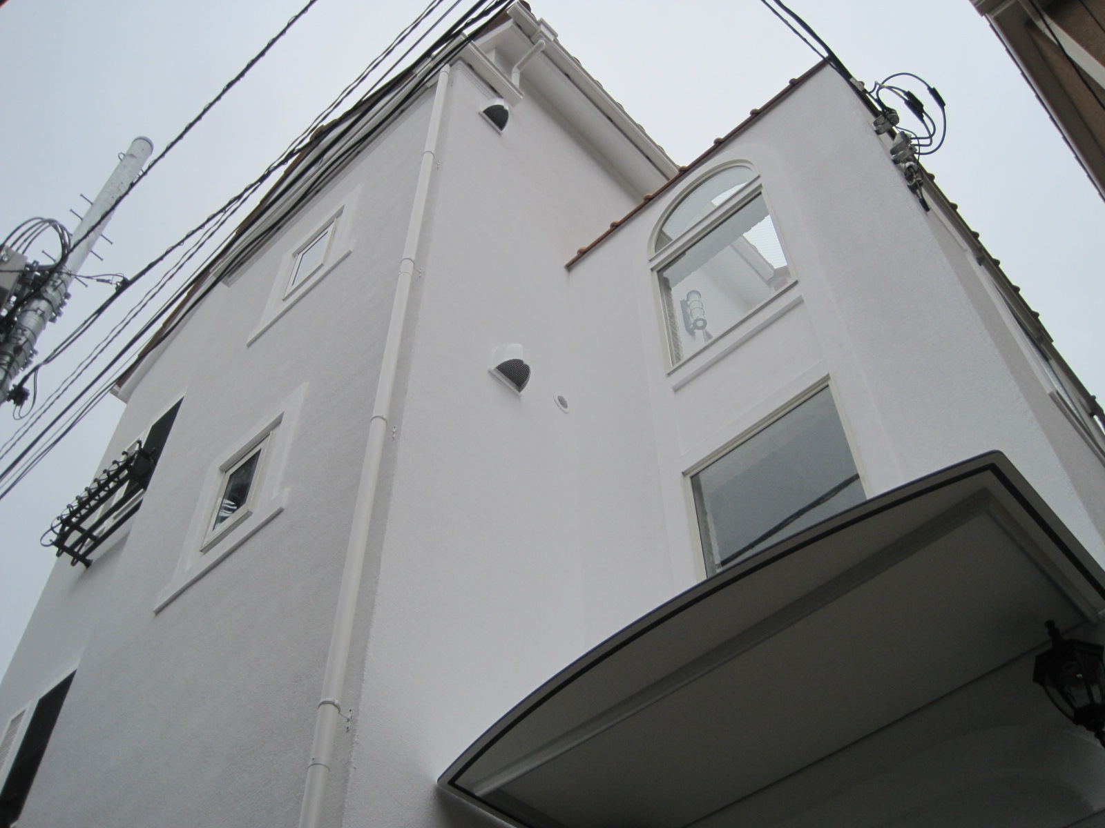 1階の目隠しが出来上がりました。青空は漆喰の白を際立たせます。