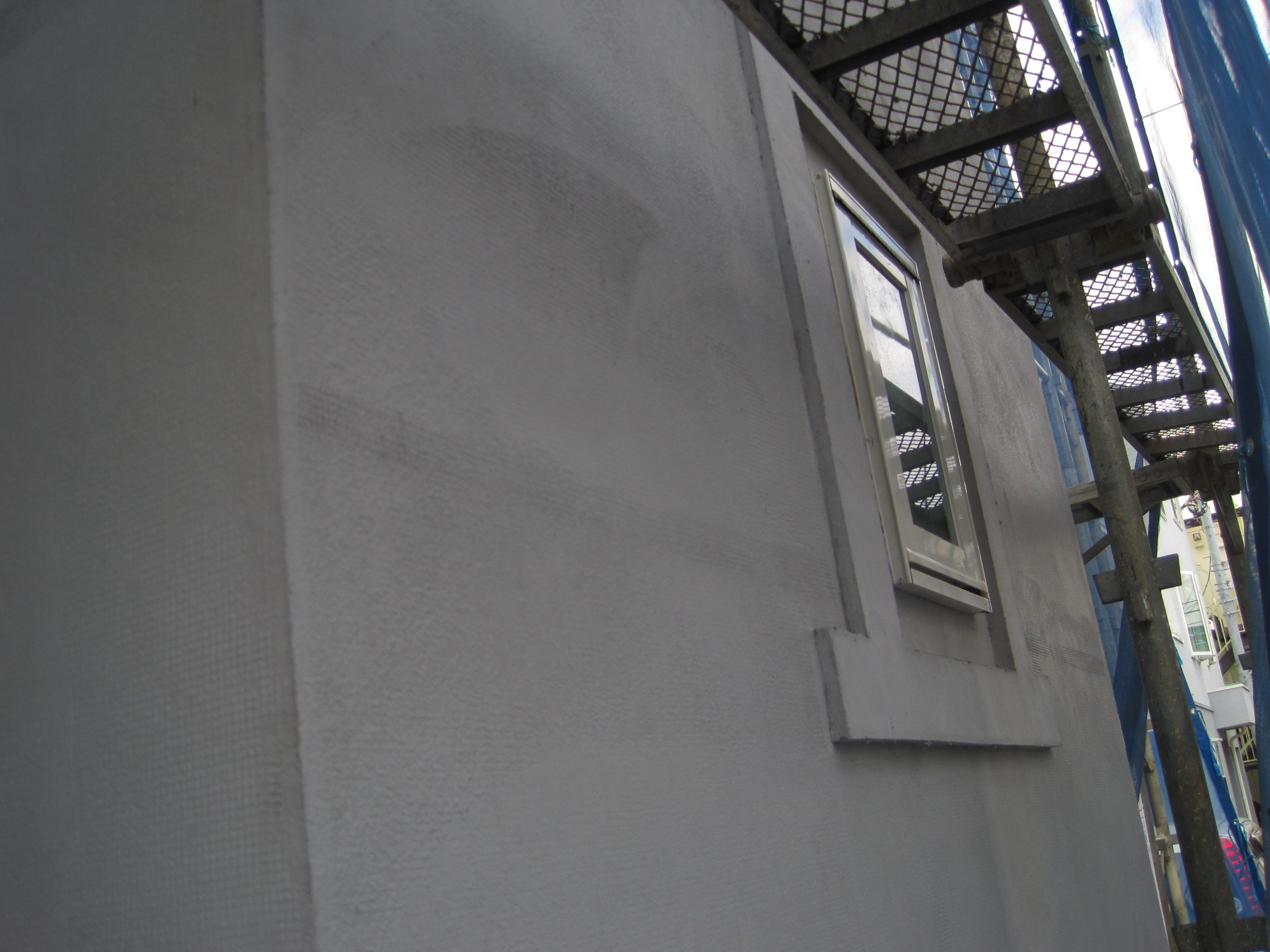 漆喰塗りの下地モルタルです。少し凹凸があるのは、グラスファイバーメッシュをモルタルが乾かないうちに塗りこんでいるからです。モルタル塗りの弱点である亀裂を防ぐ役目をもっています。