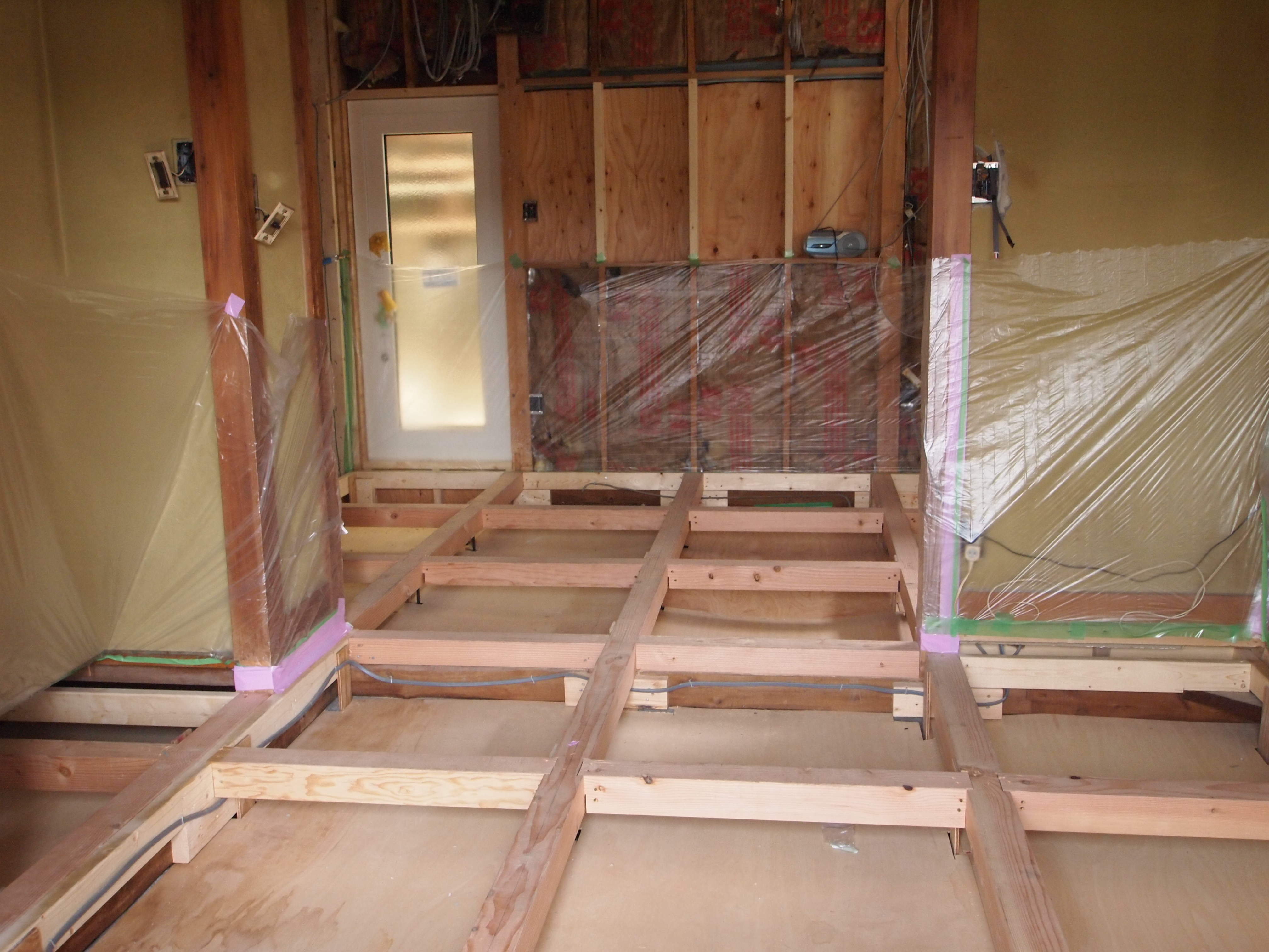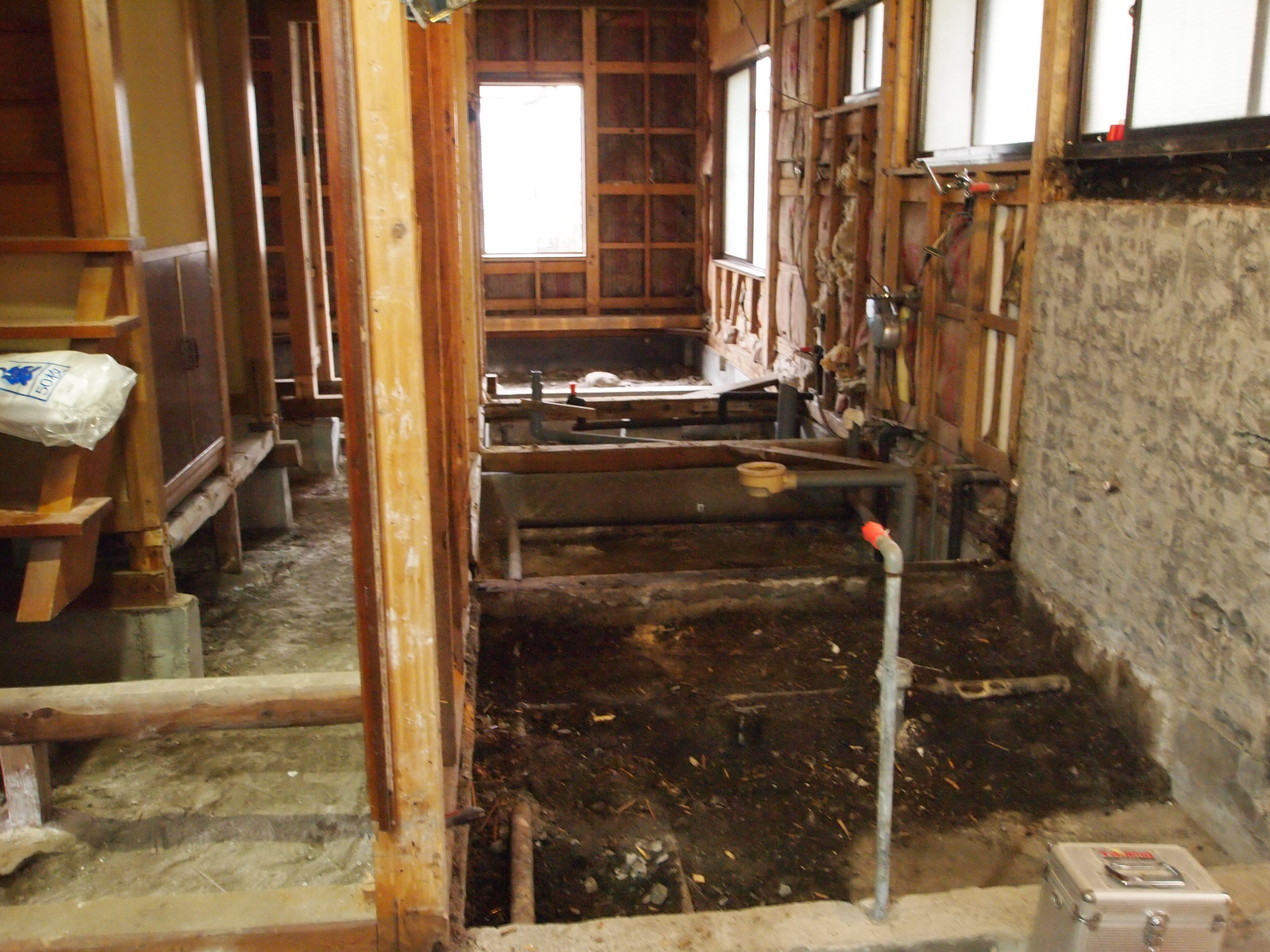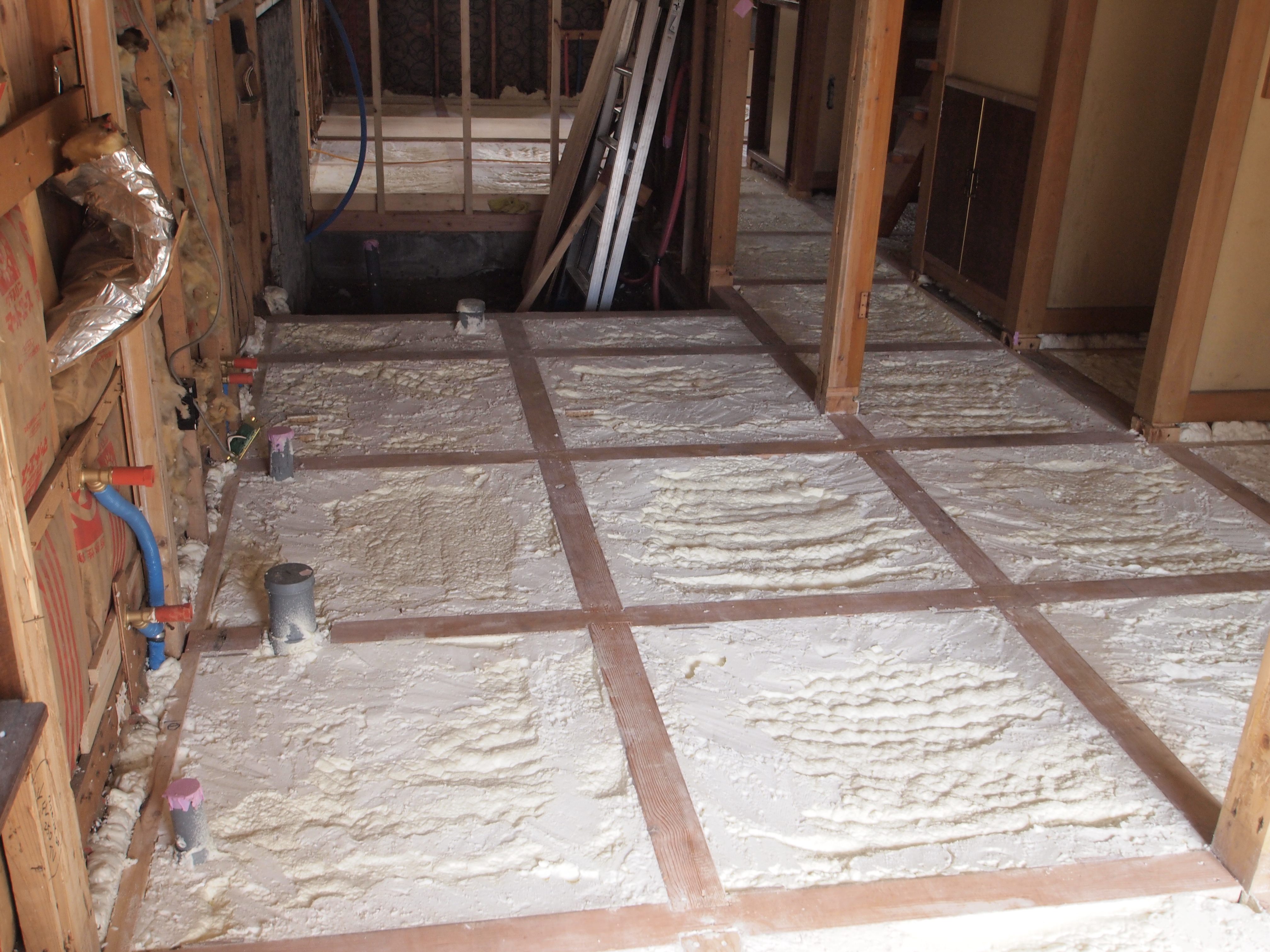 一階床上蓄熱式床暖房施工、浴室トイレ洗面リビング台所ローカ