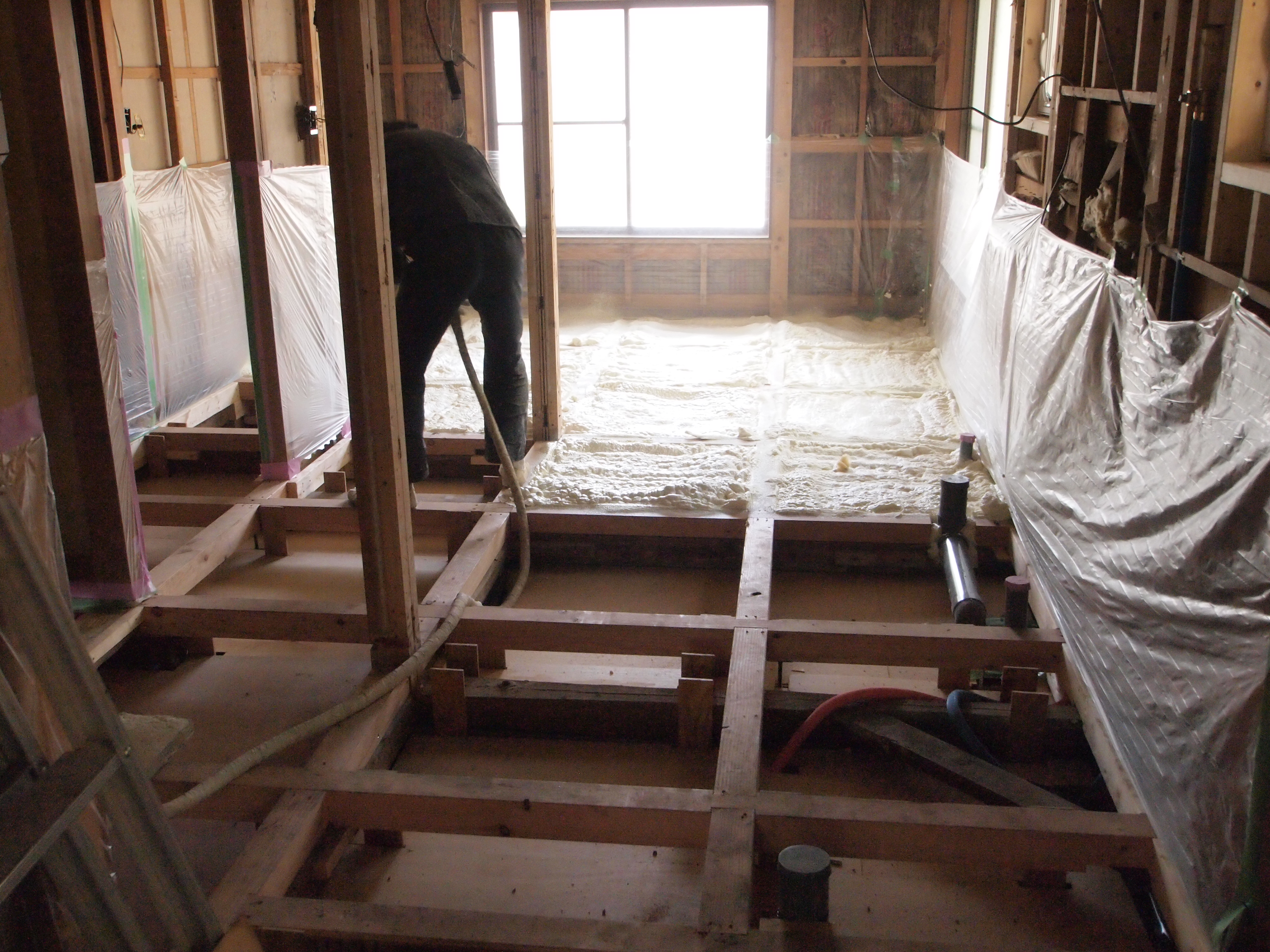 現場発泡ウレタン施工中。断熱材が垂れ下がらず、土台との隙間が無く気密施工できる利点があります。