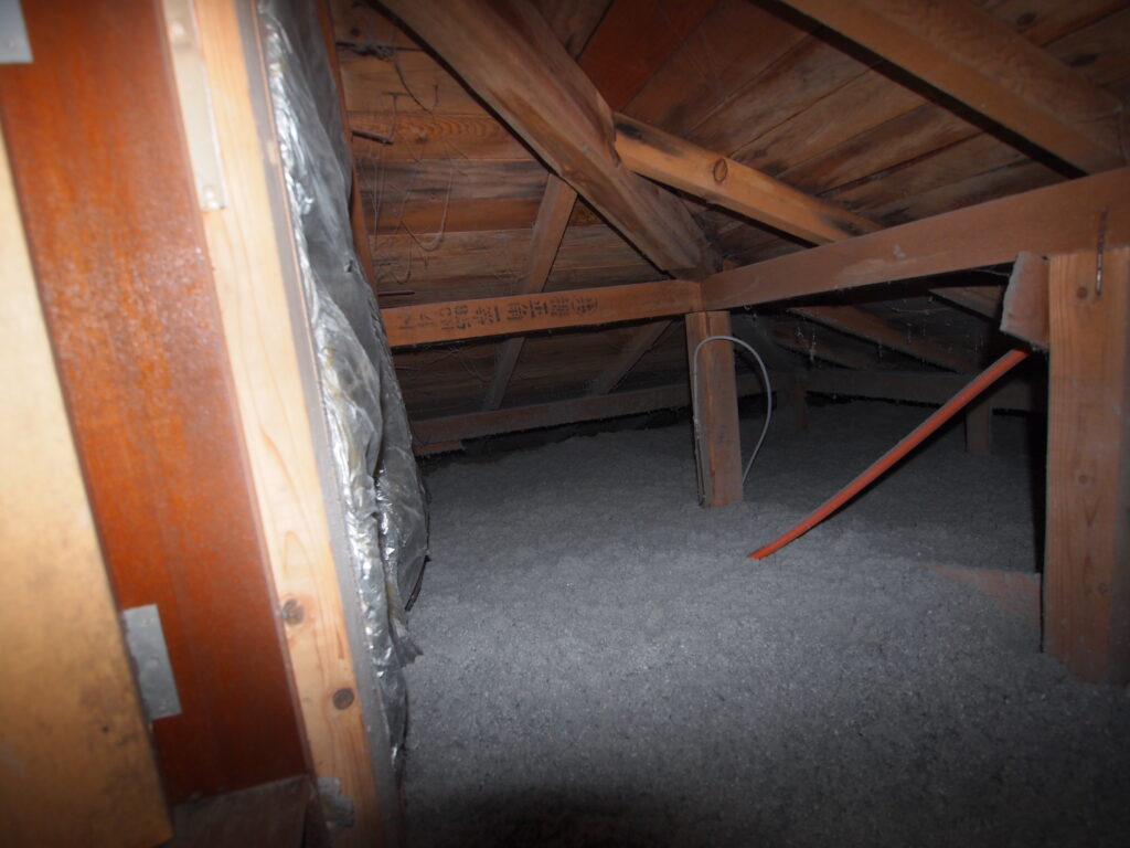 天井断熱はセルローズファイバー吹込み300㎜厚です。断熱改修ではすでに電気配線が走っているため、天井断熱材は隙間なく施工できる沈降性のある断熱材セルローズファイバーが向いています。