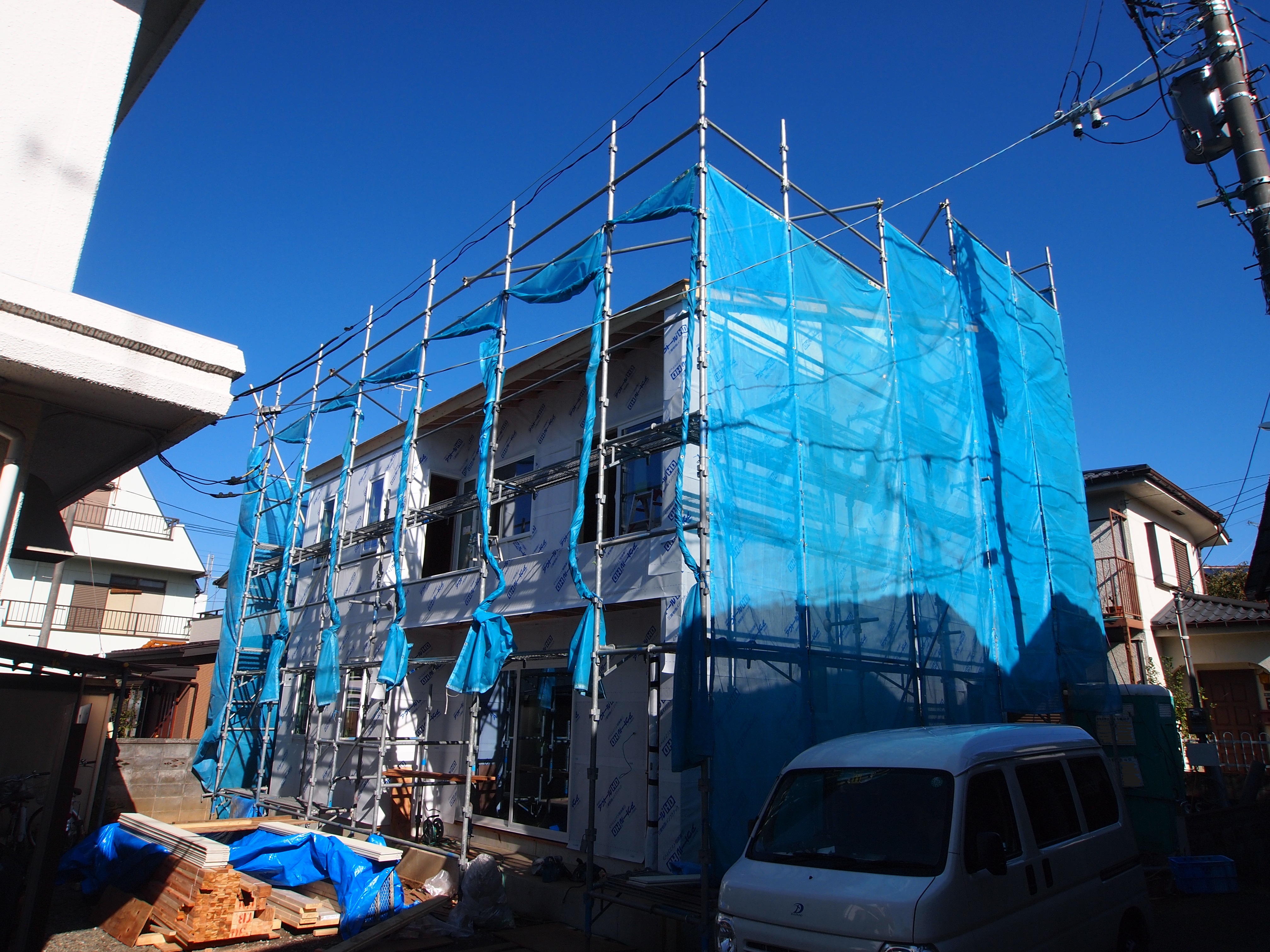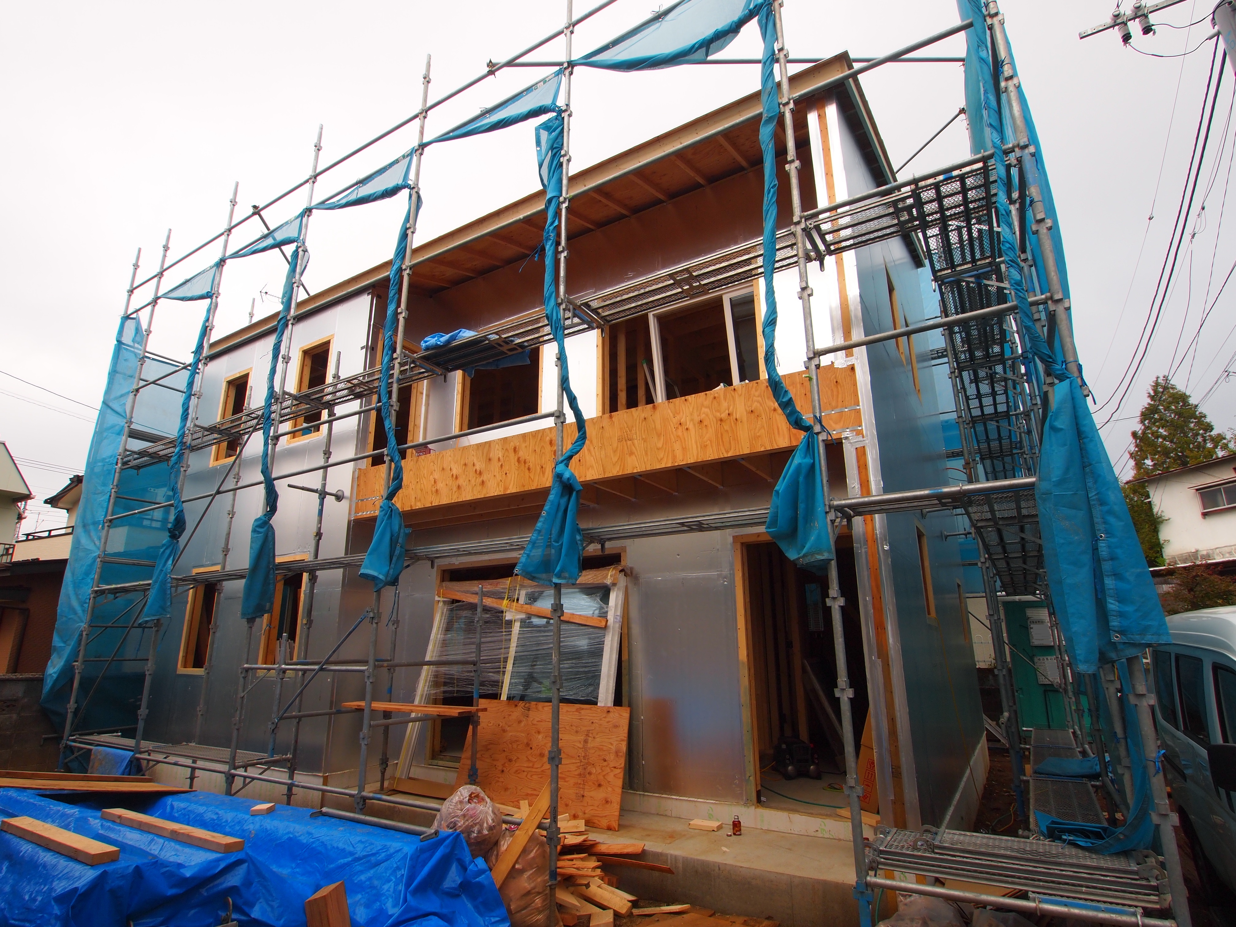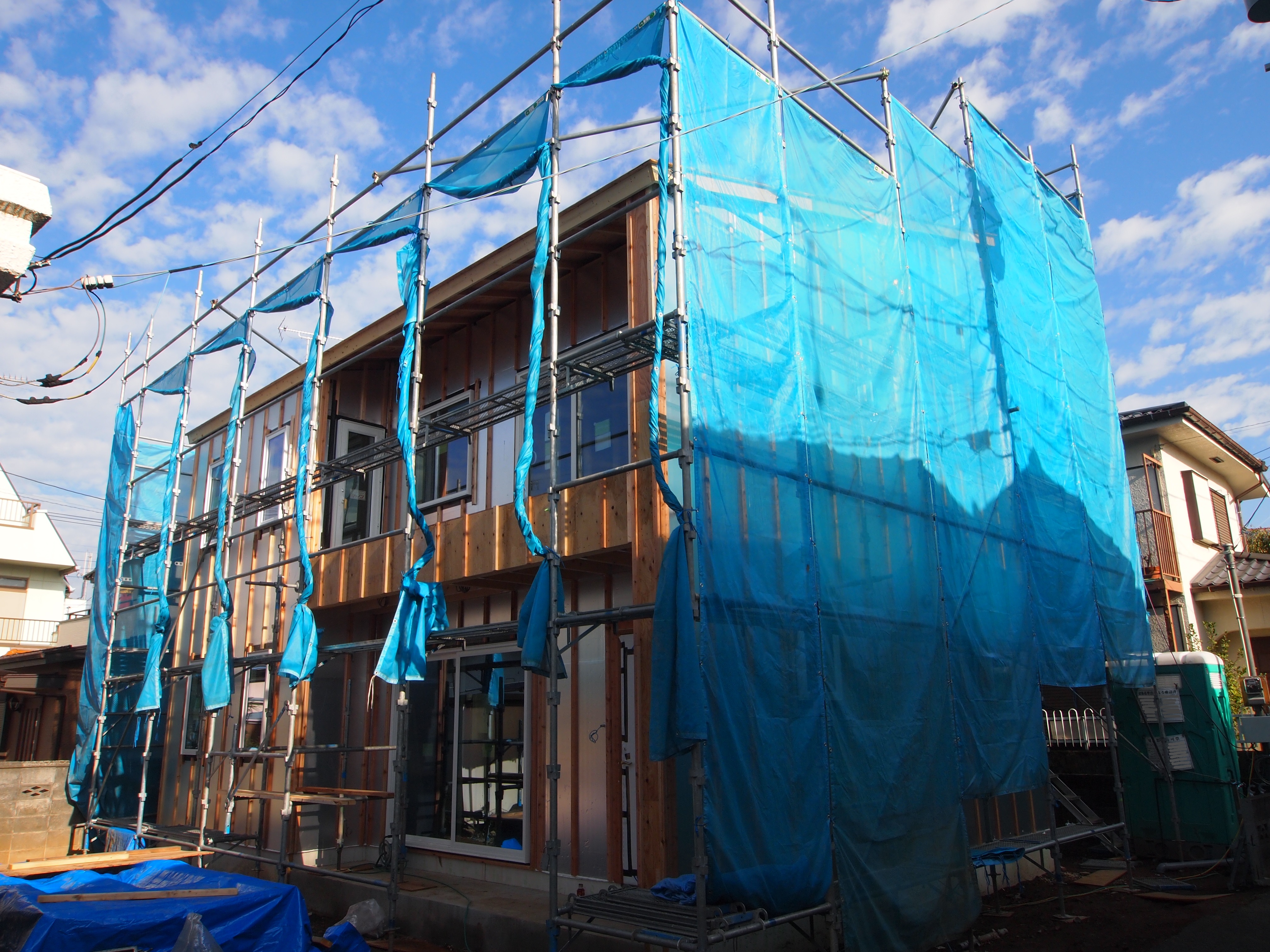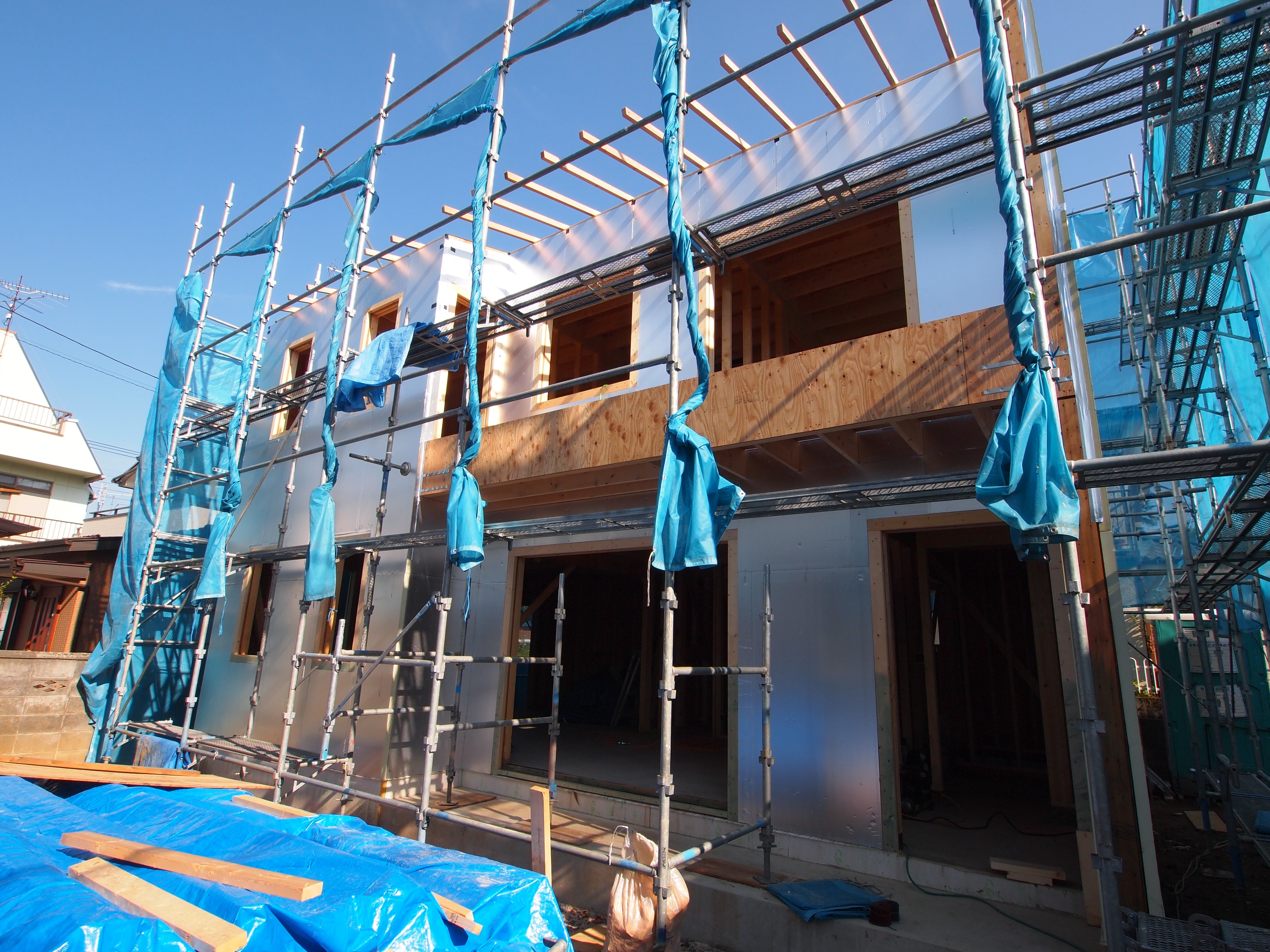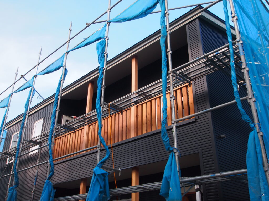 縦胴縁の上から防水シートを張っています。縦胴縁を雨水から保護します。