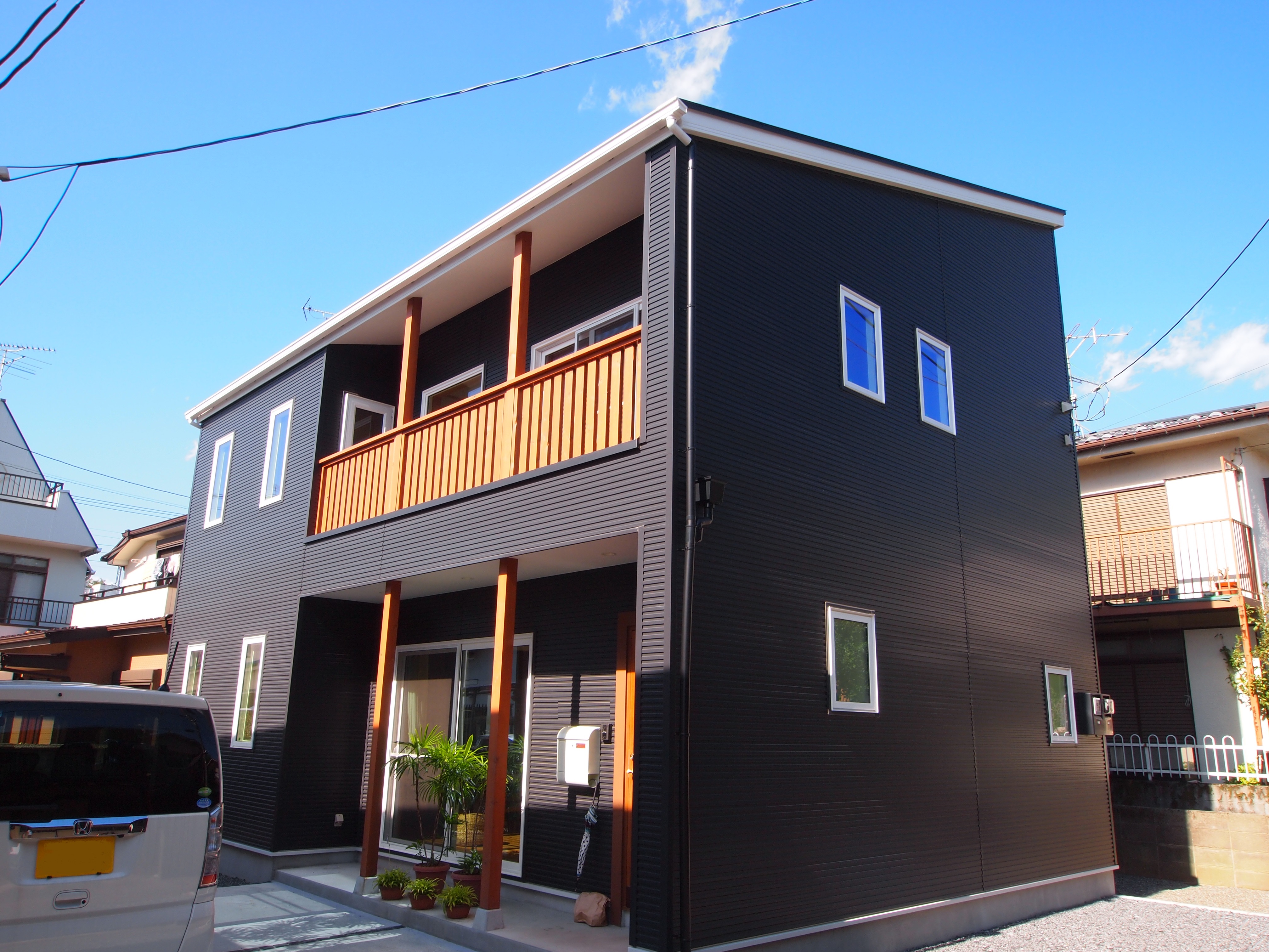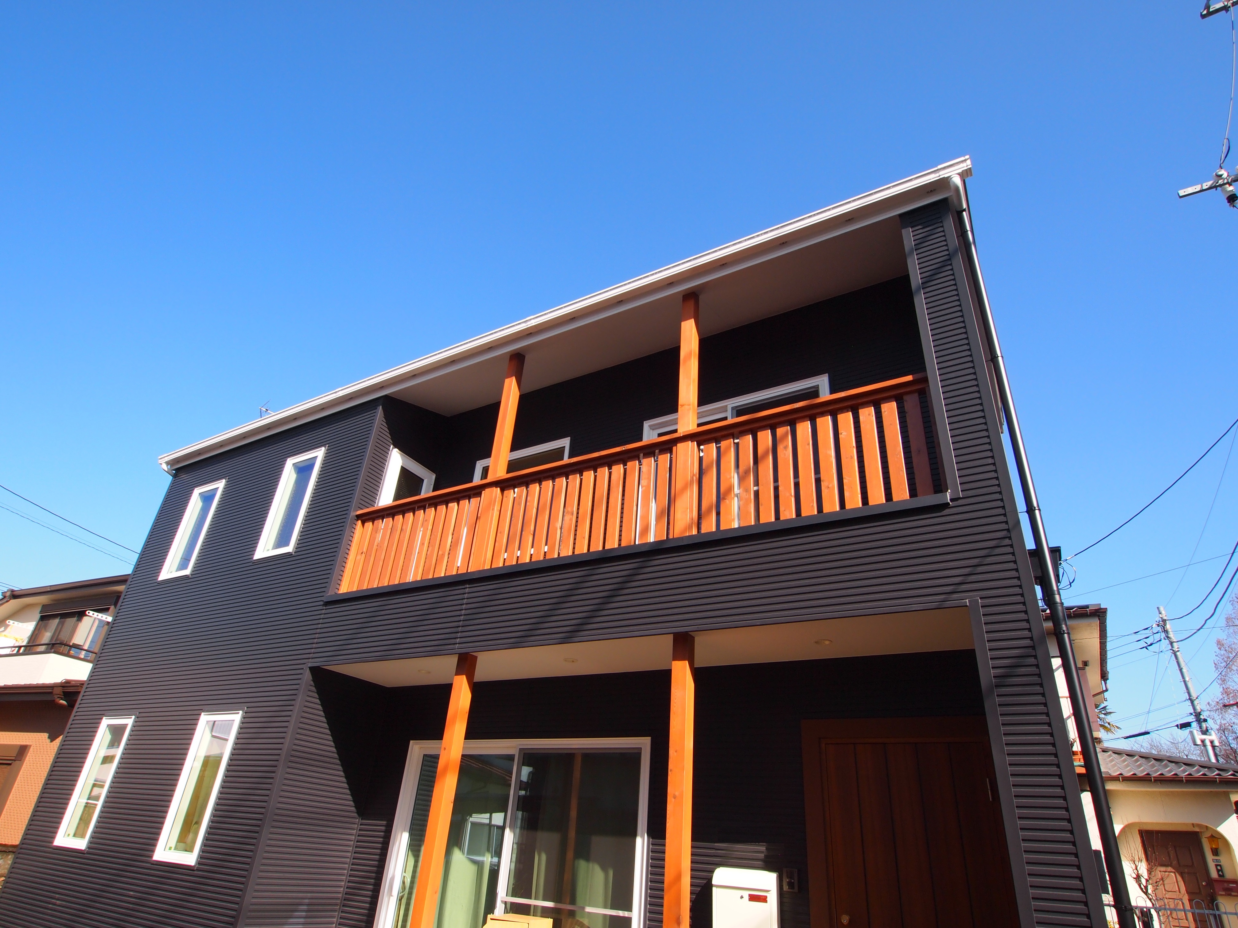 ベランダ手摺はレッドシダー材で製作しました。