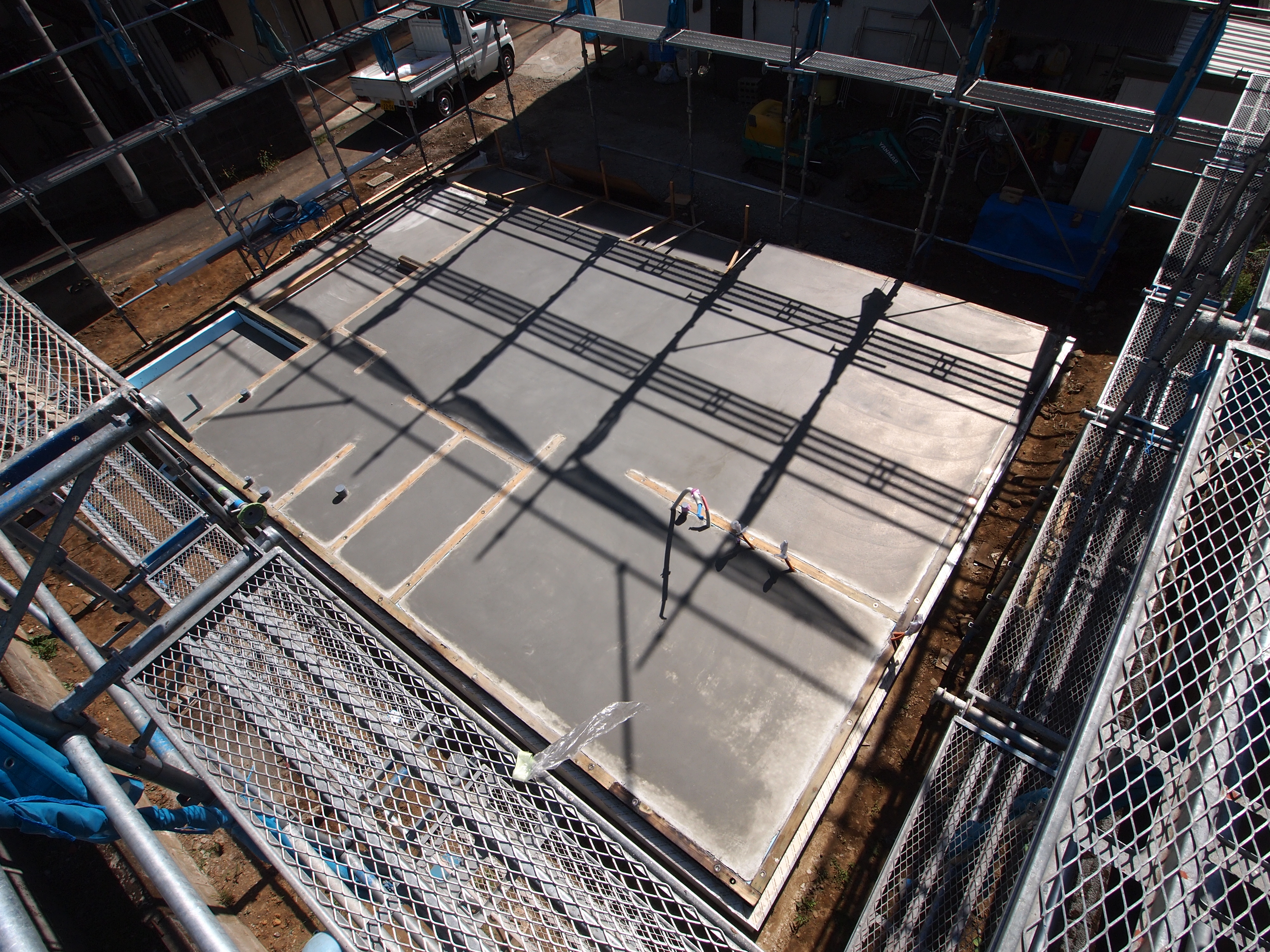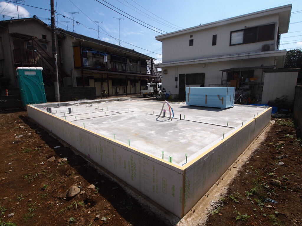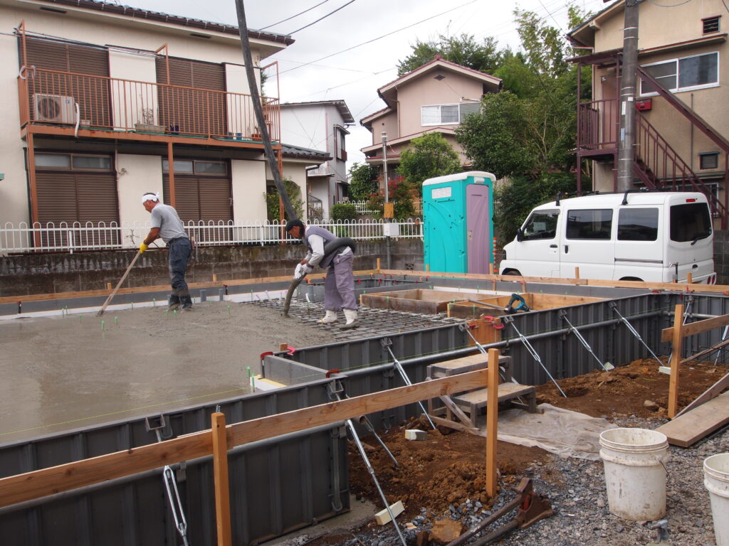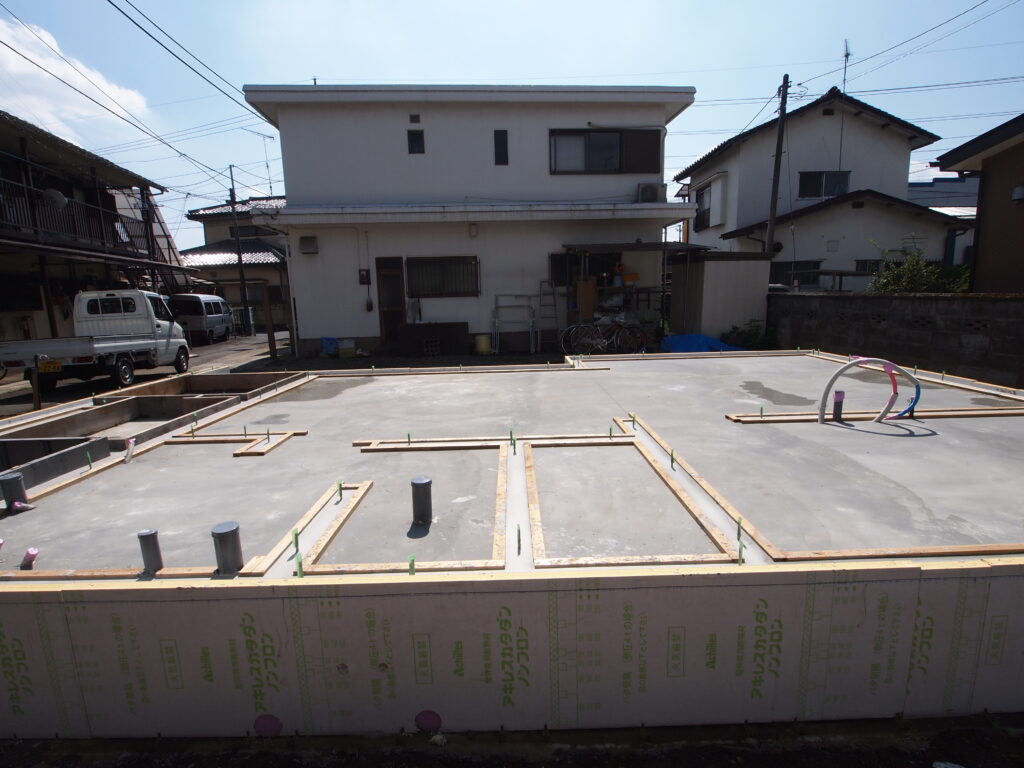 コンクリートを打設しました。シロアリの侵入対策として効果のある立ち上り部と耐圧盤を一気に打設する一体打ちです。