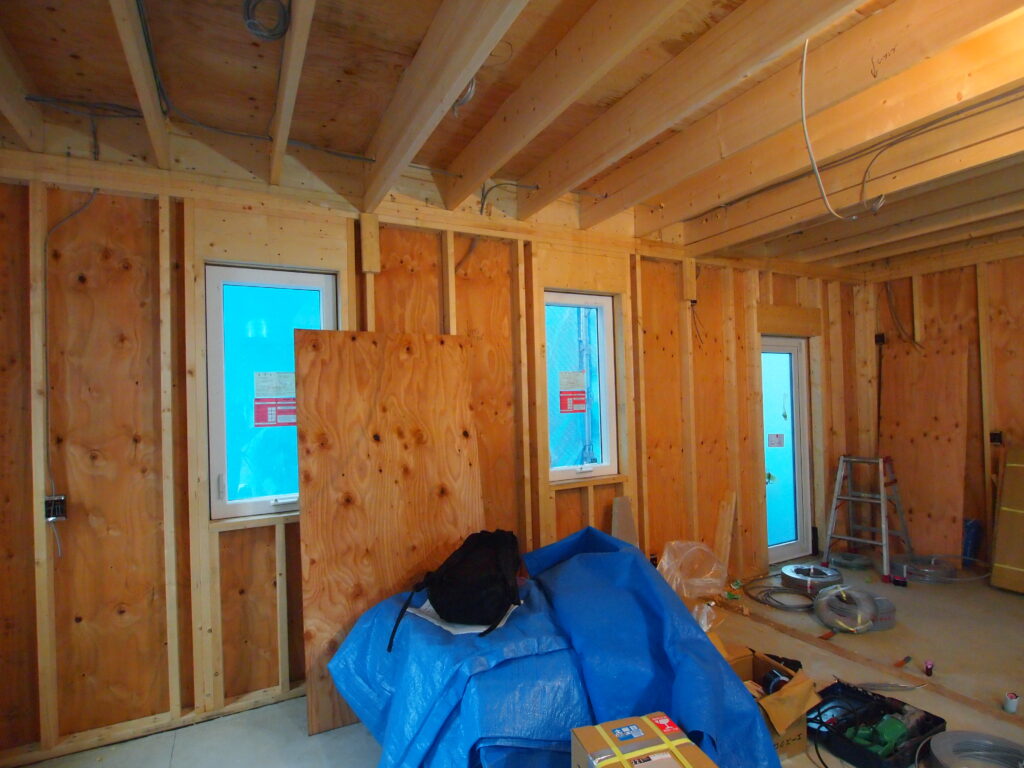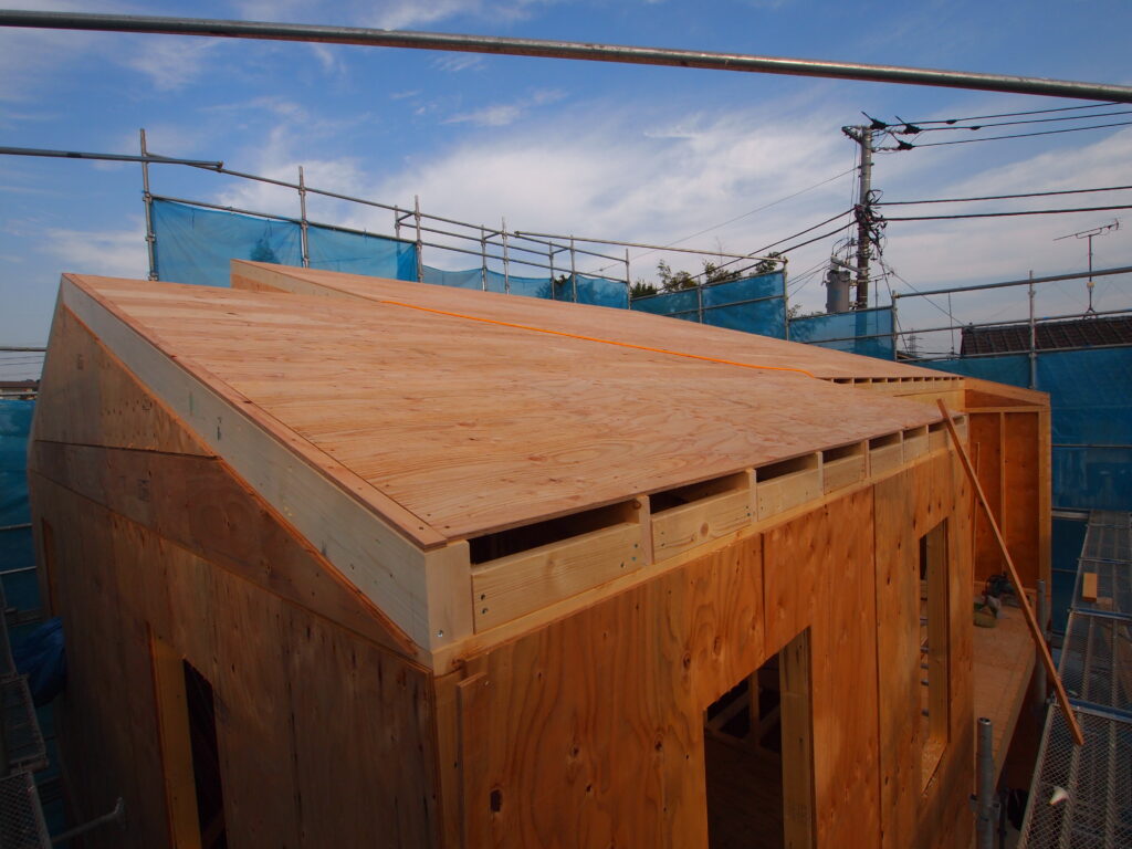 一層目の野地板まで張り上げました。この上にQ1ボード断熱材100㎜を敷き込みます。