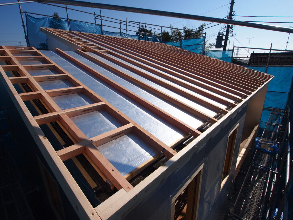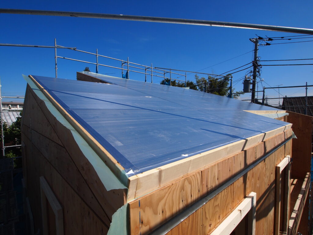 屋根に断熱材を張り、屋根と外壁の継ぎ目となる周囲には気密シートを張っています。