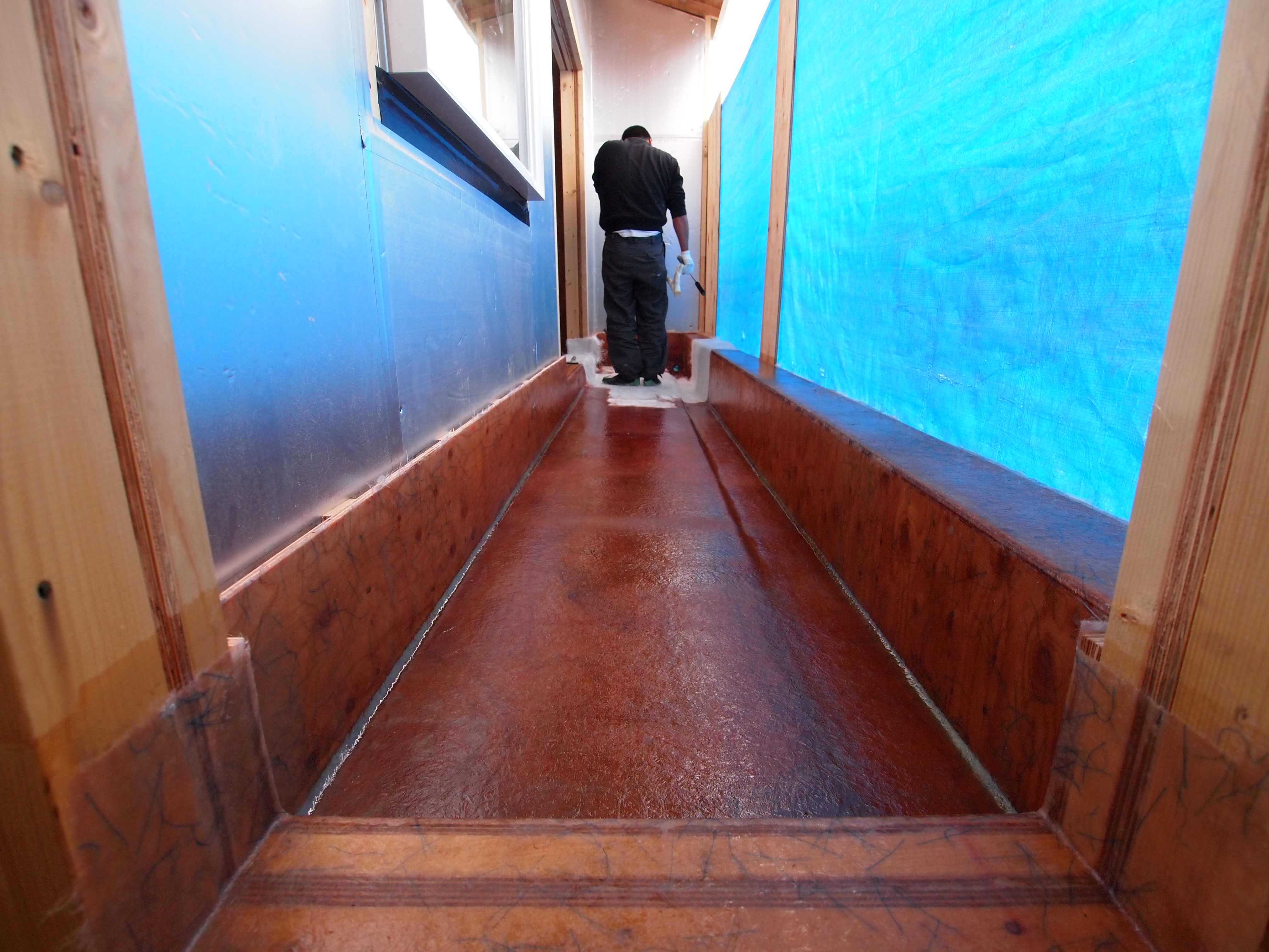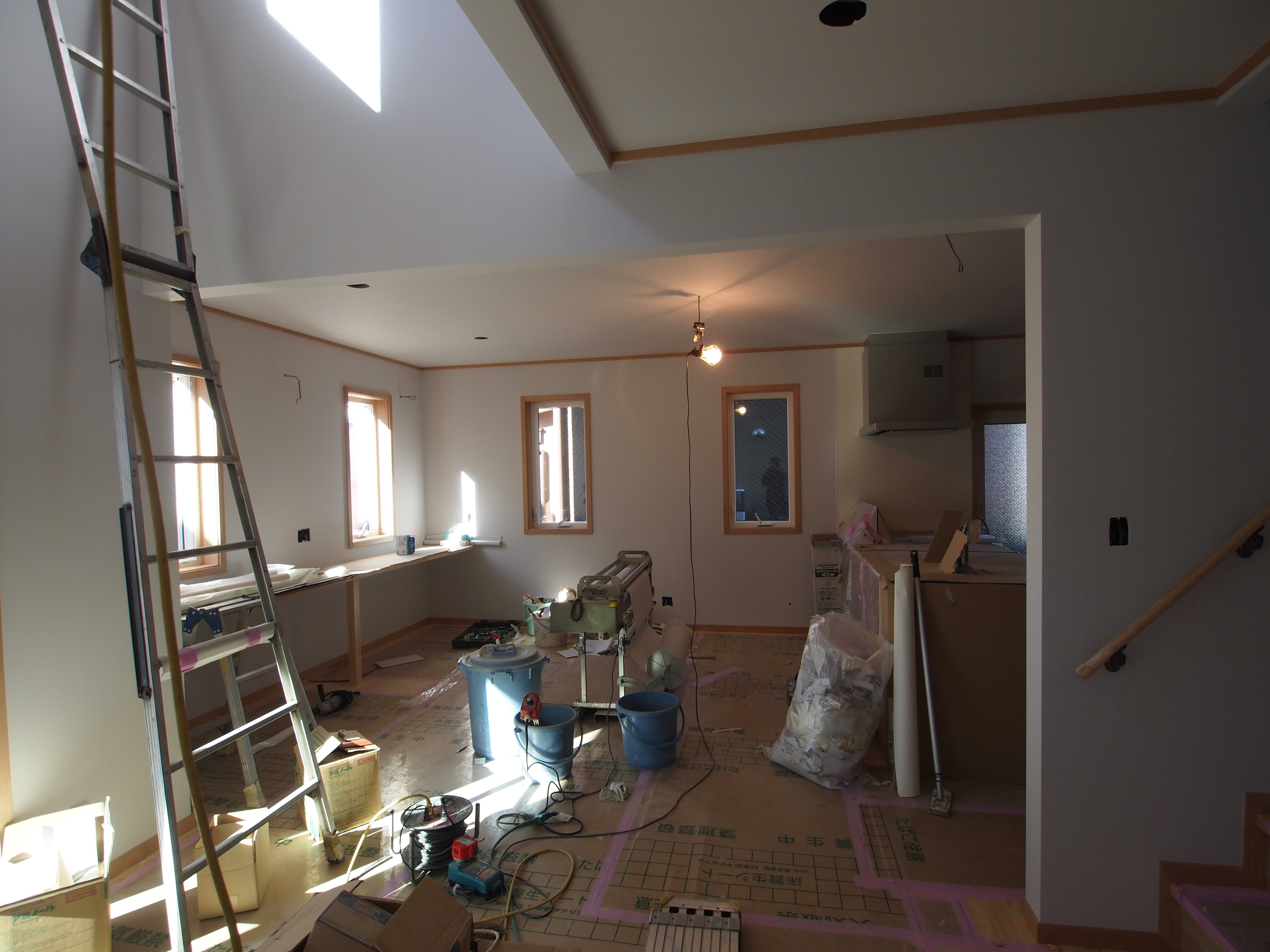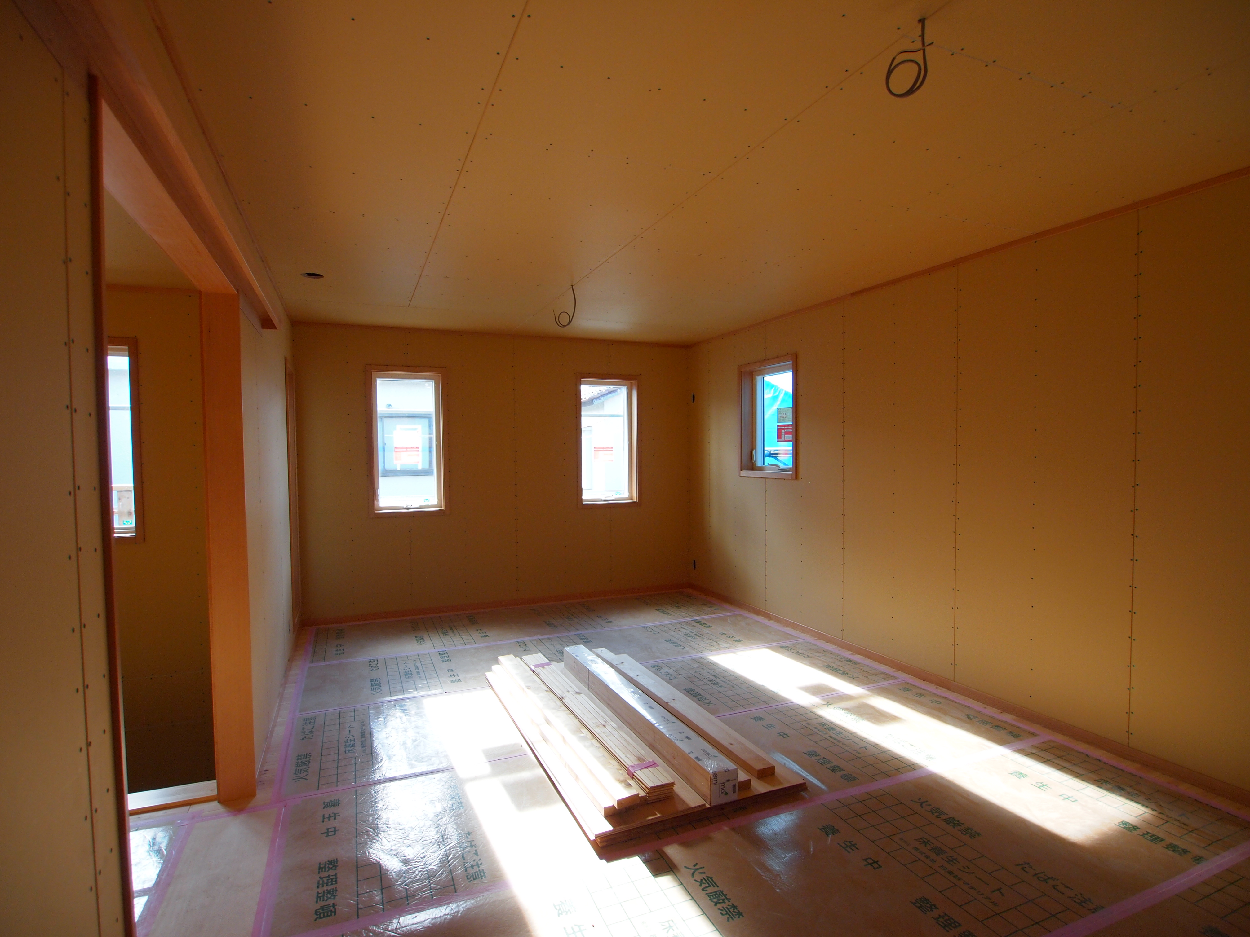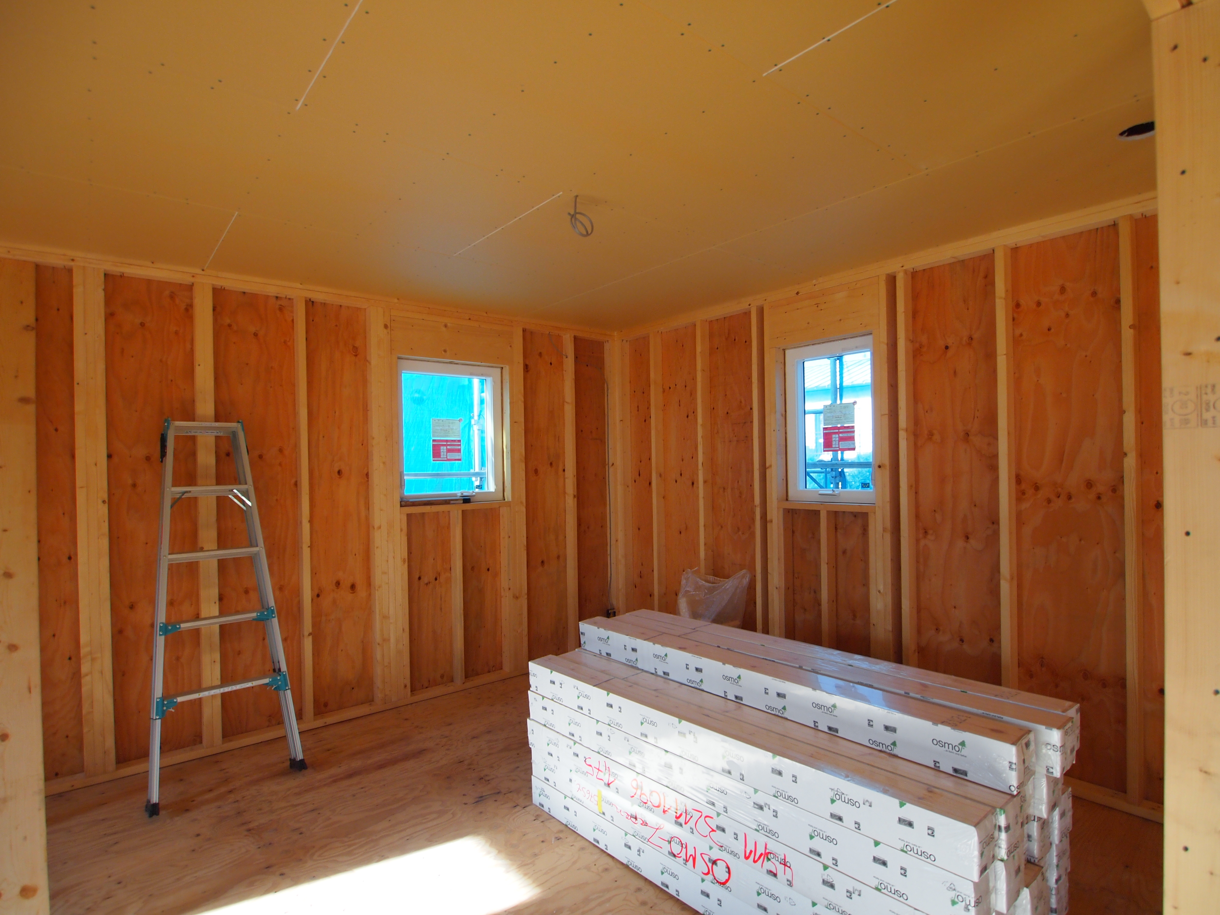 天井の石膏ボード張りを終え、これからオスモ自然塗料仕上の無垢パインフローリングを貼る予定です。