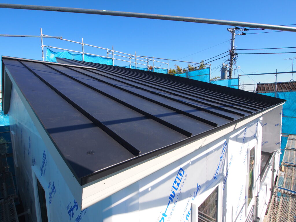 ガルバニウム鋼板縦ハゼ葺き完了しました。これから太陽光パネル8.3KWを搭載します。