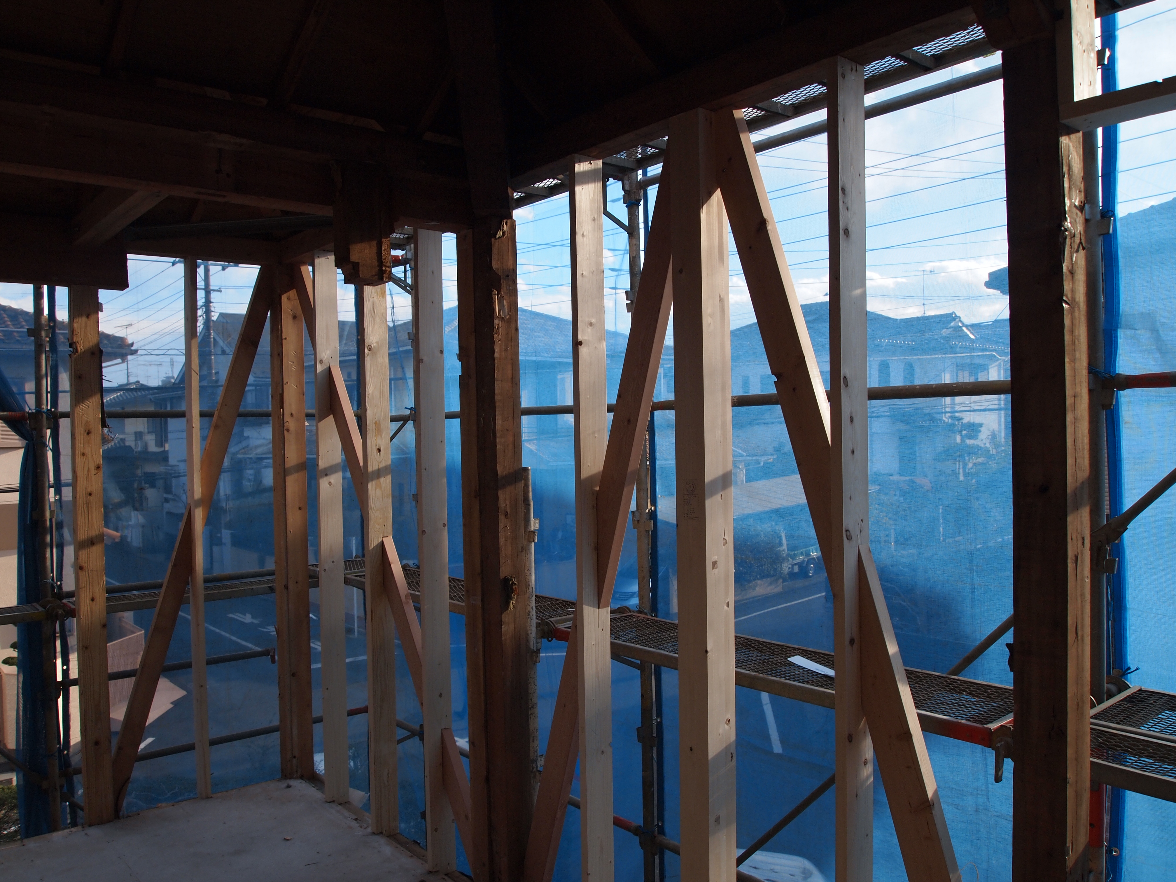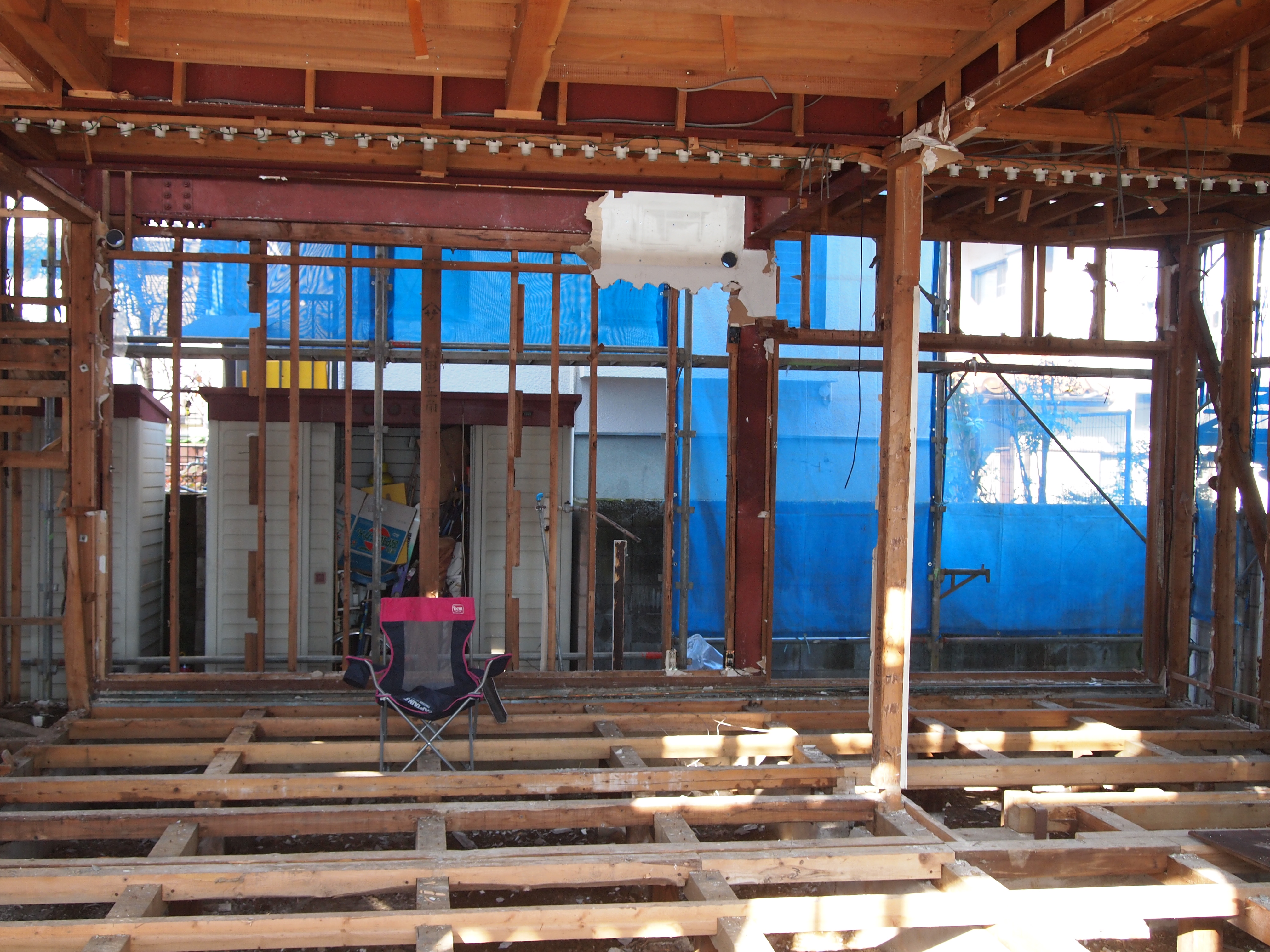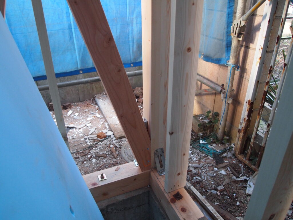 間柱はすべて取替ました。劣化した柱も取替て引き抜き強度を計算し金物で補強しました。