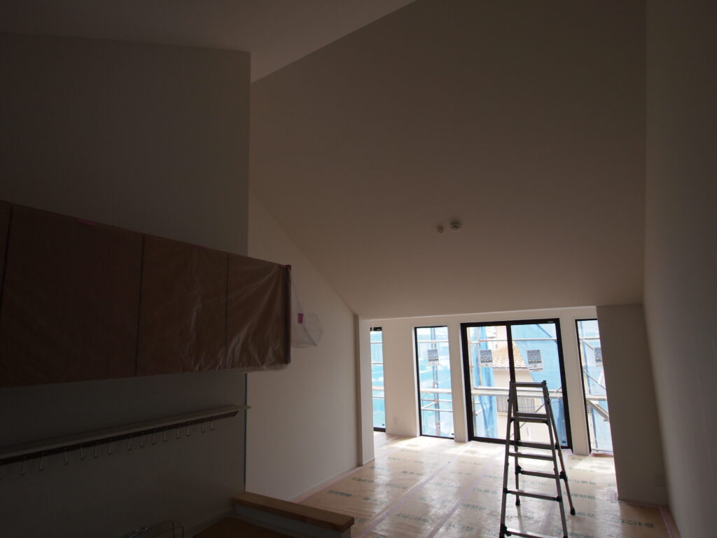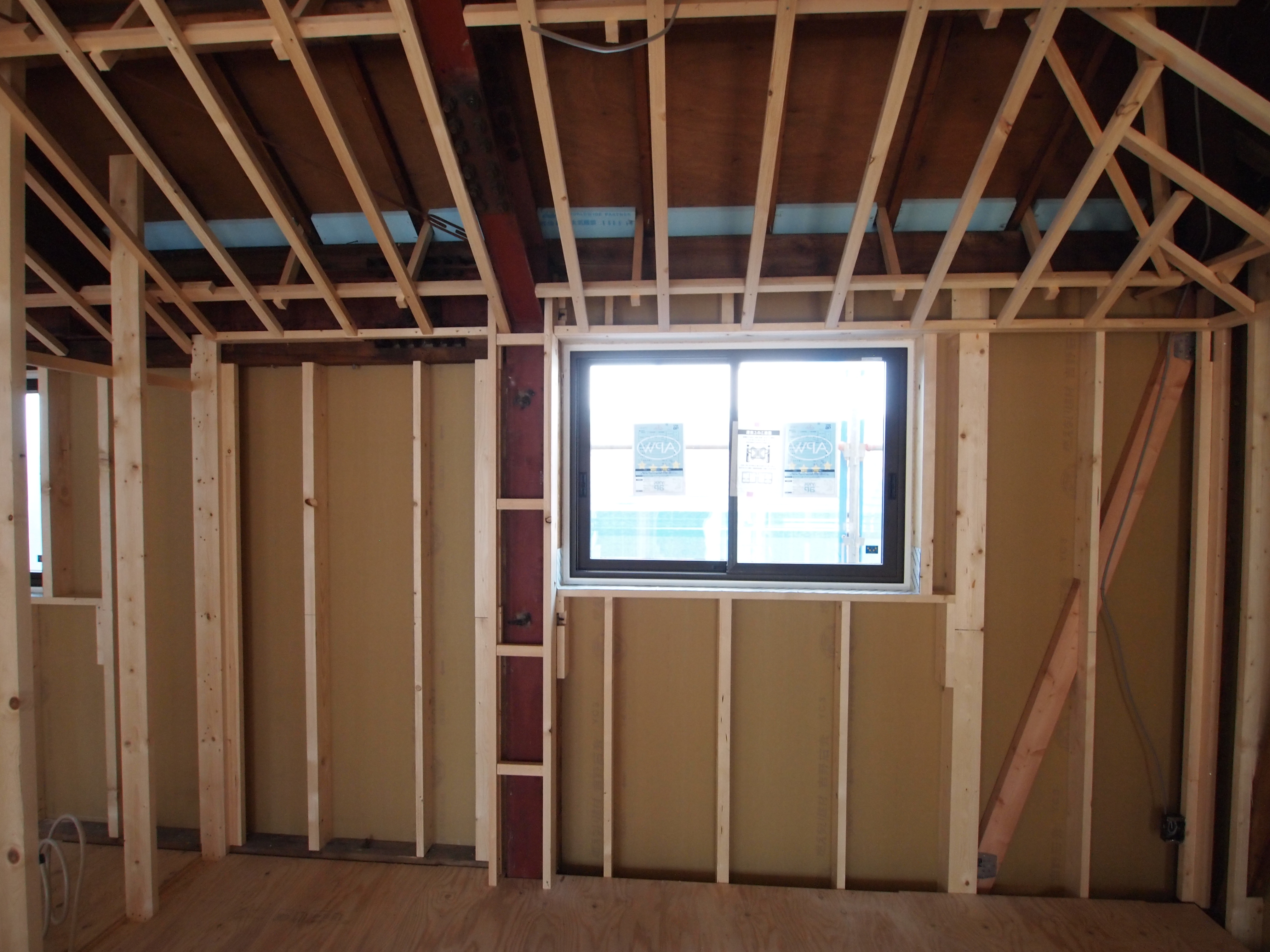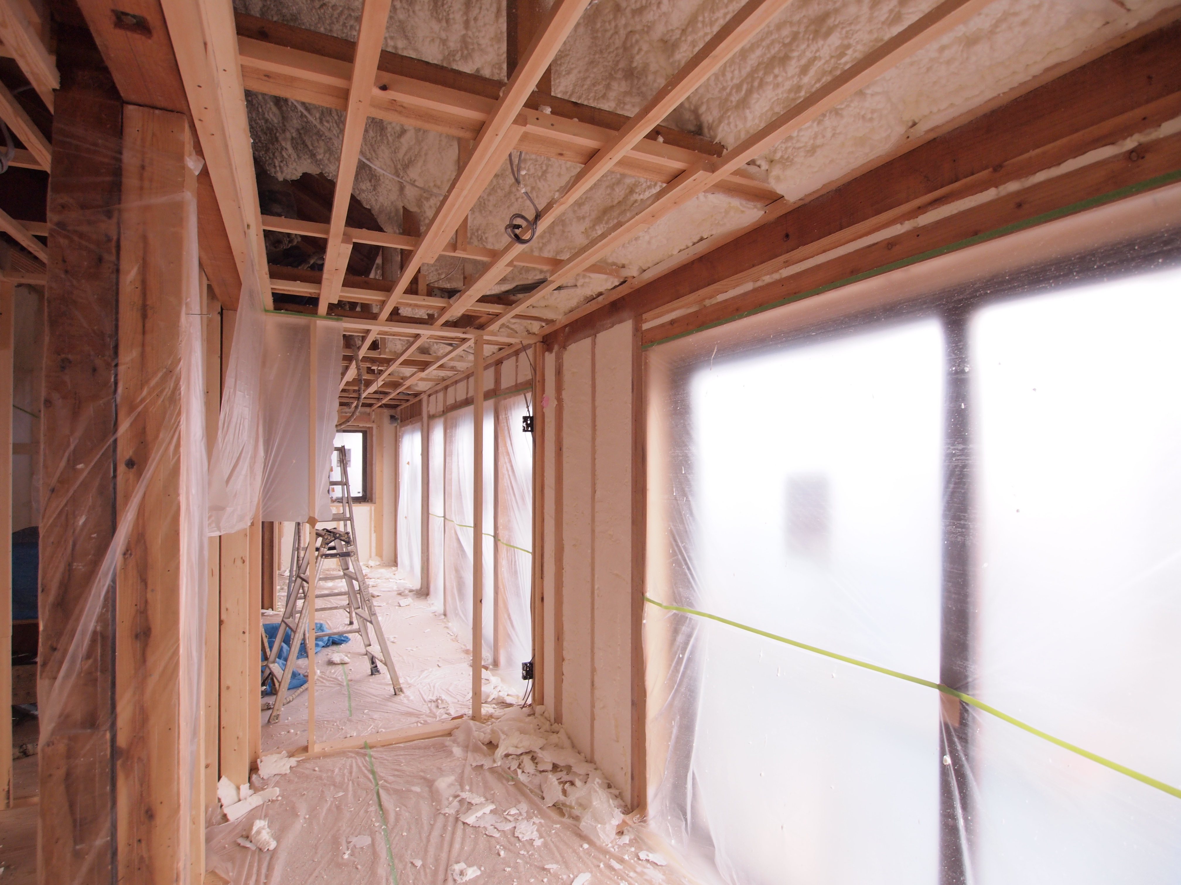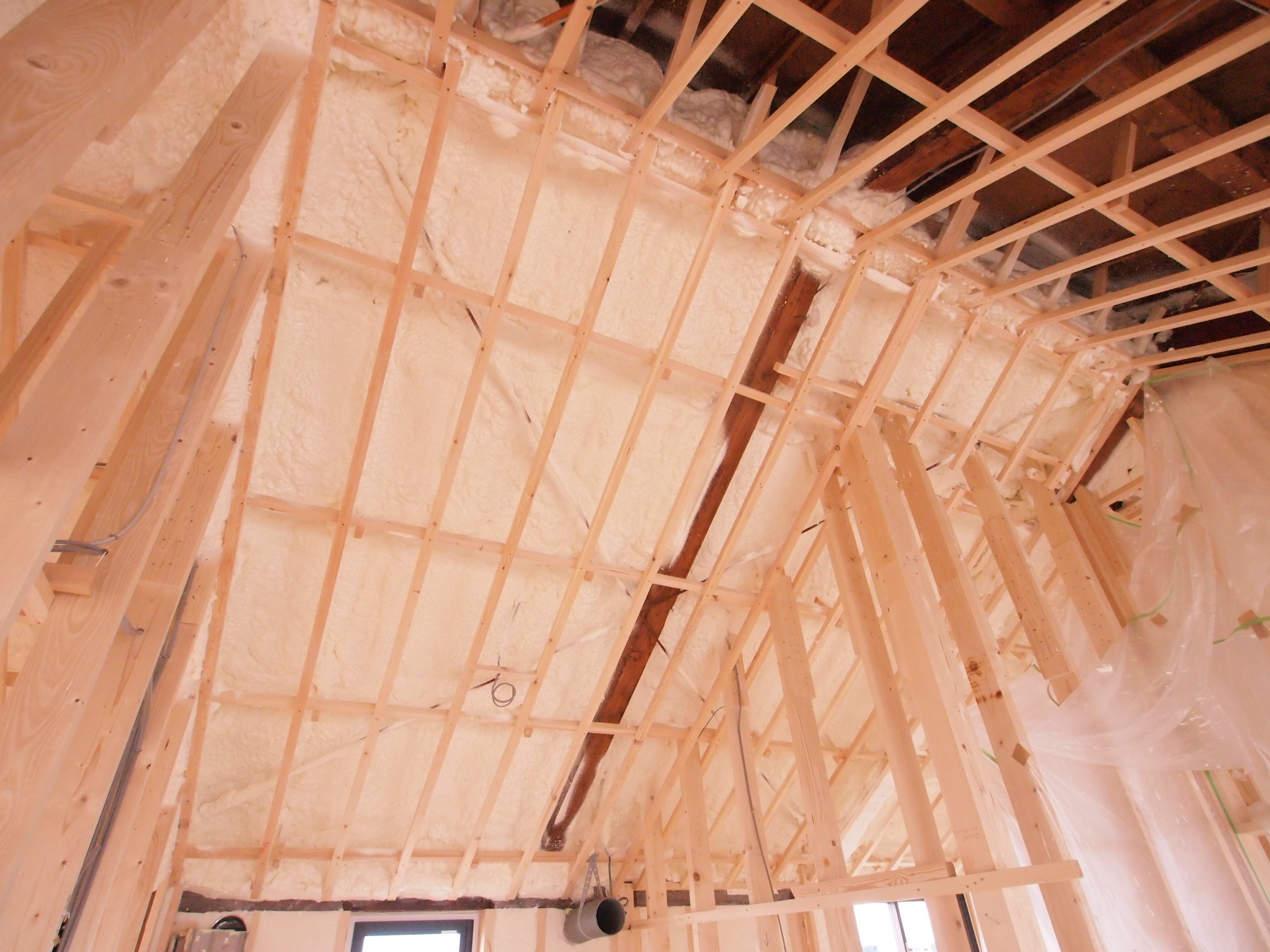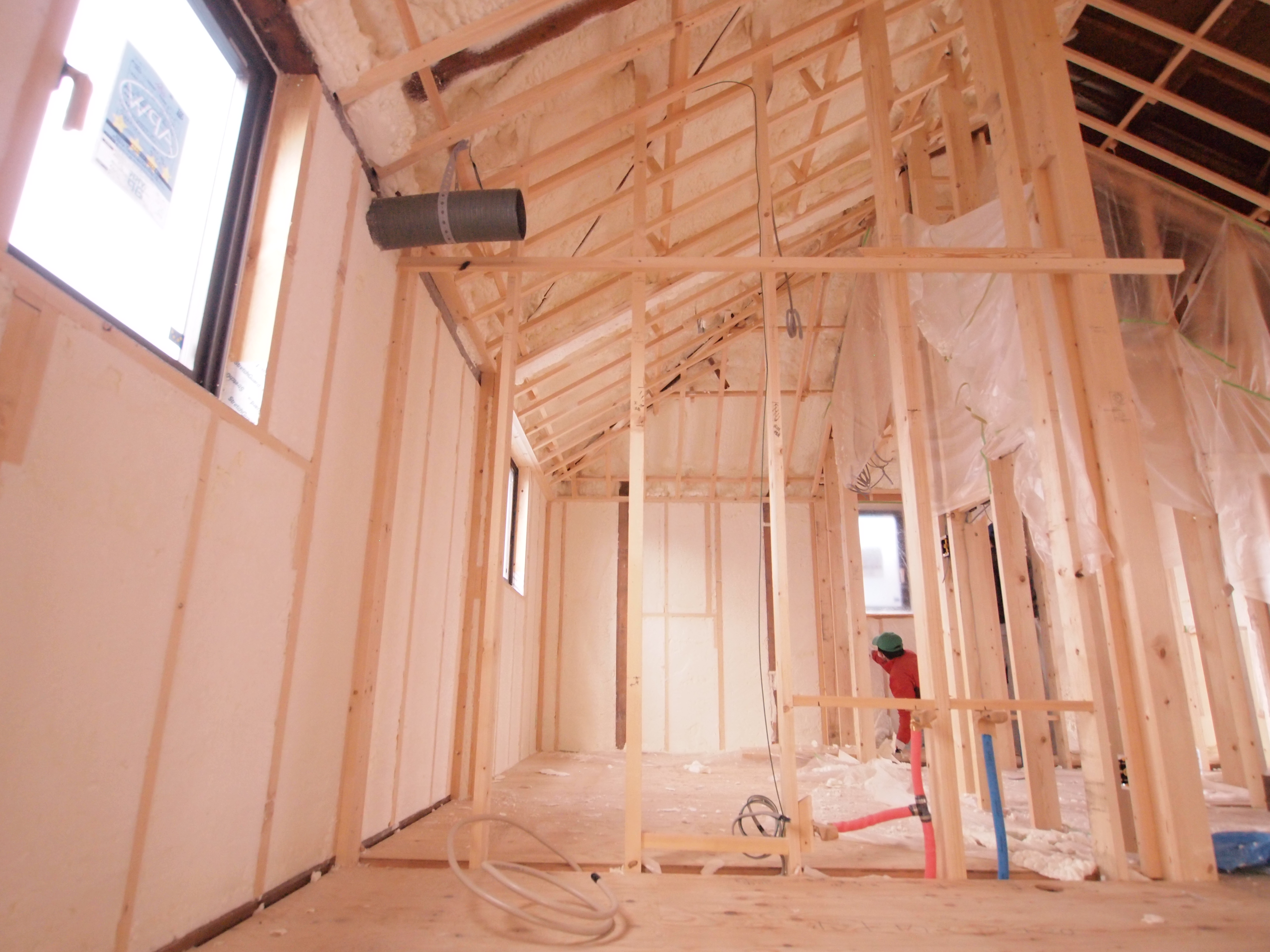 現場発泡断熱材アクアフォームを吹き付けました。壁105㎜厚、屋根200㎜厚、床150㎜厚です。