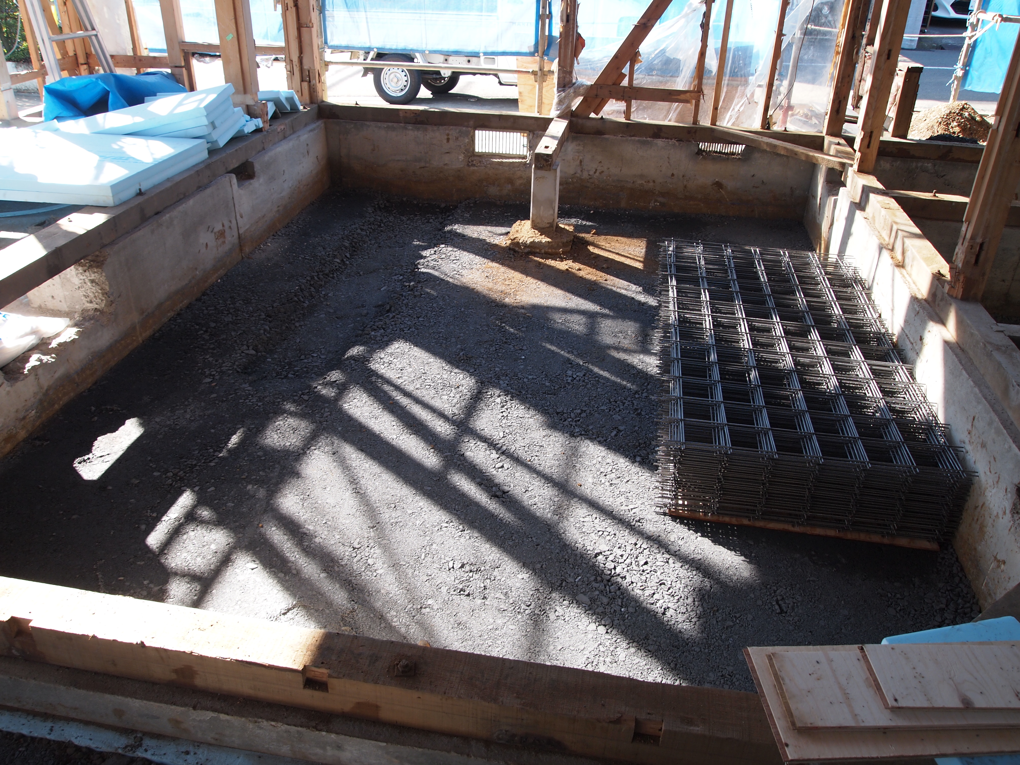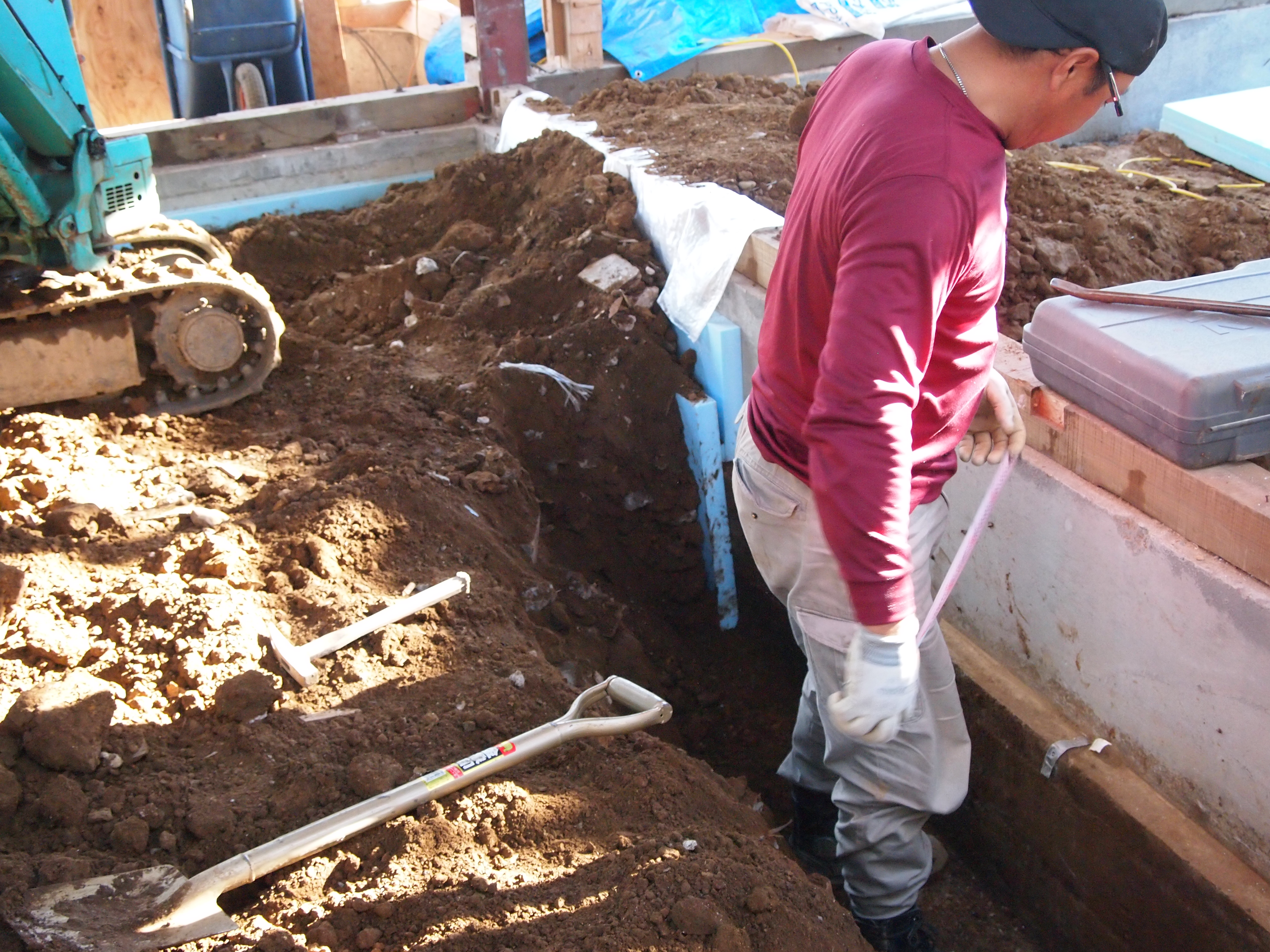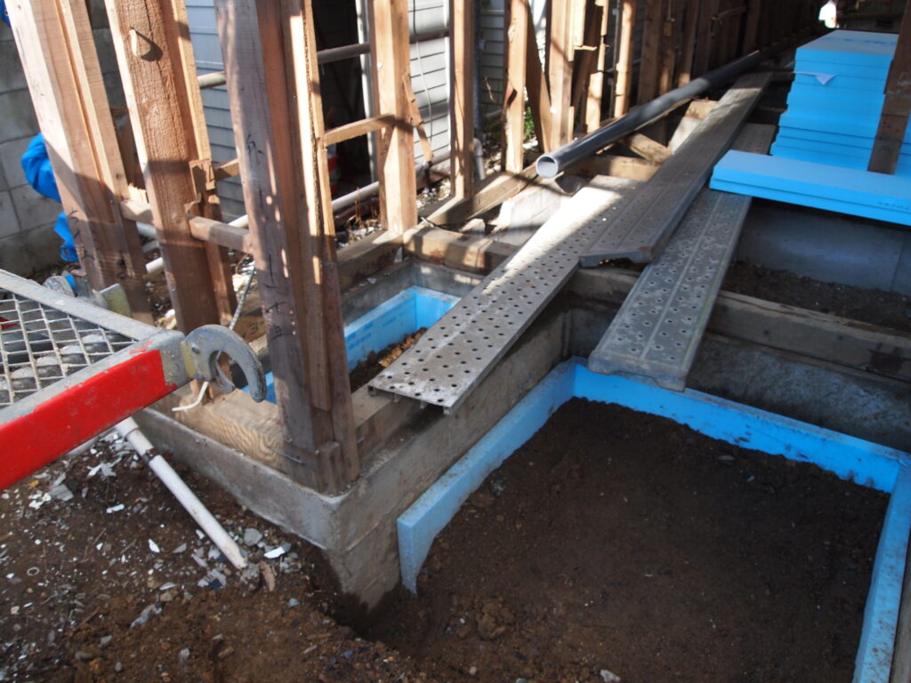 鉄骨部の地中梁は設計図より深く入っていました。約1m下まで基礎断熱を行いました。