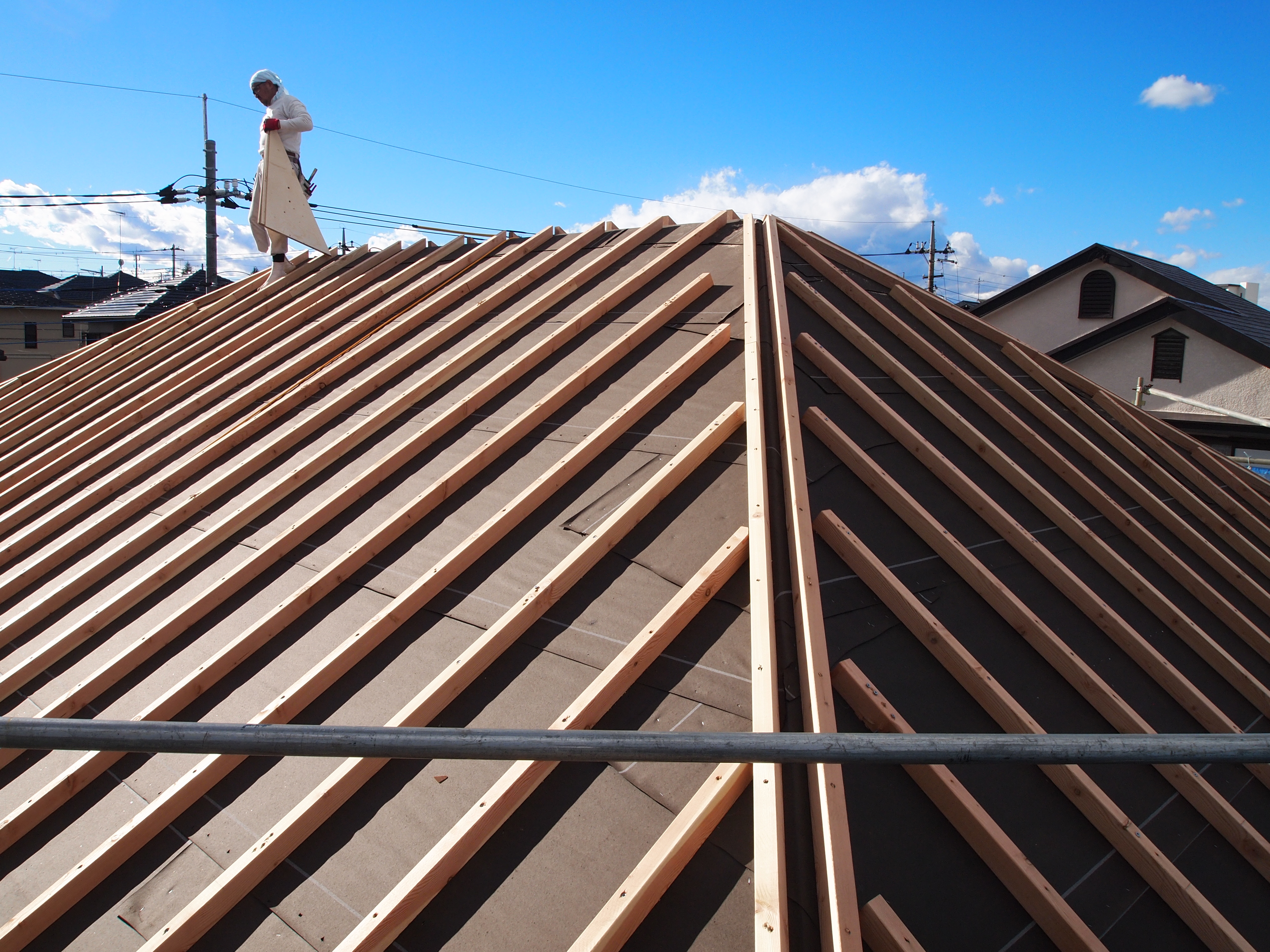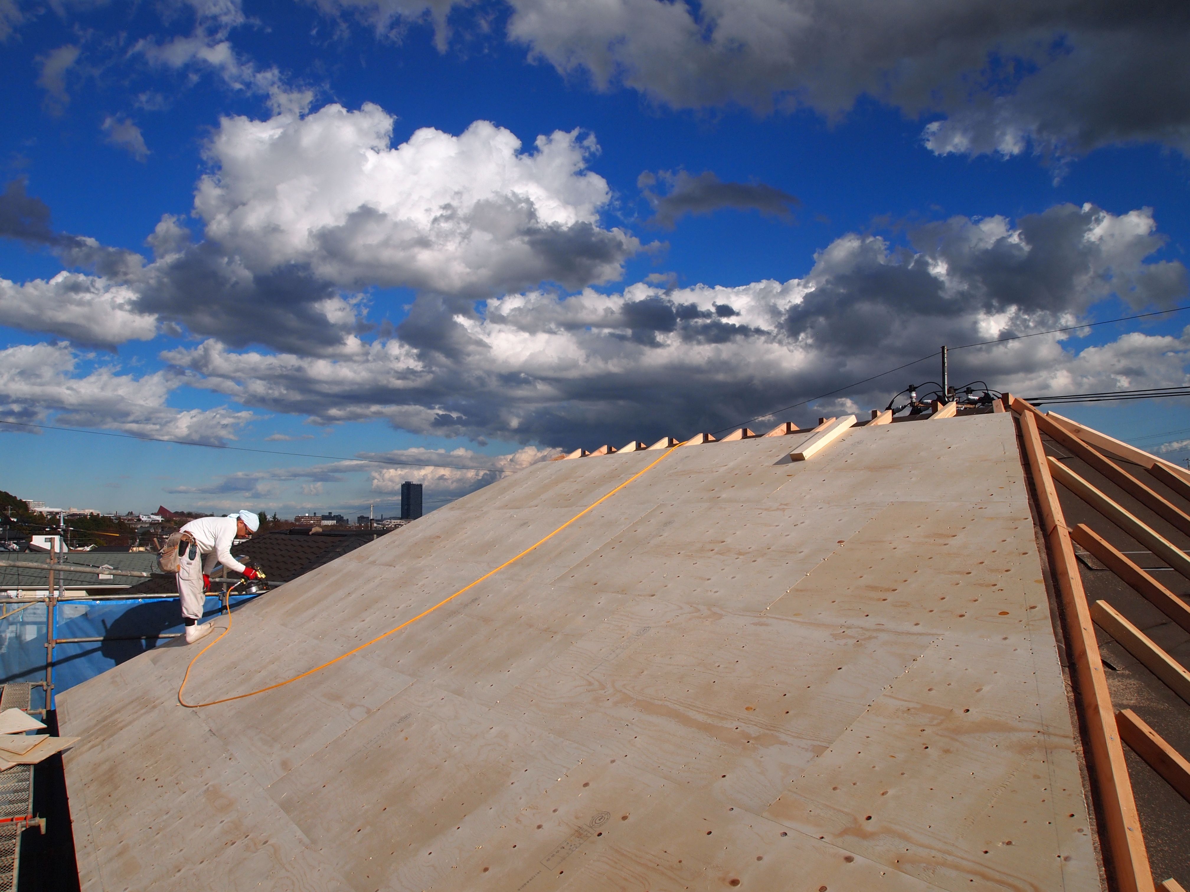 屋根は二重屋根になります。既存野地板の上に通気垂木を流しその上に新たに野地板を貼ります。