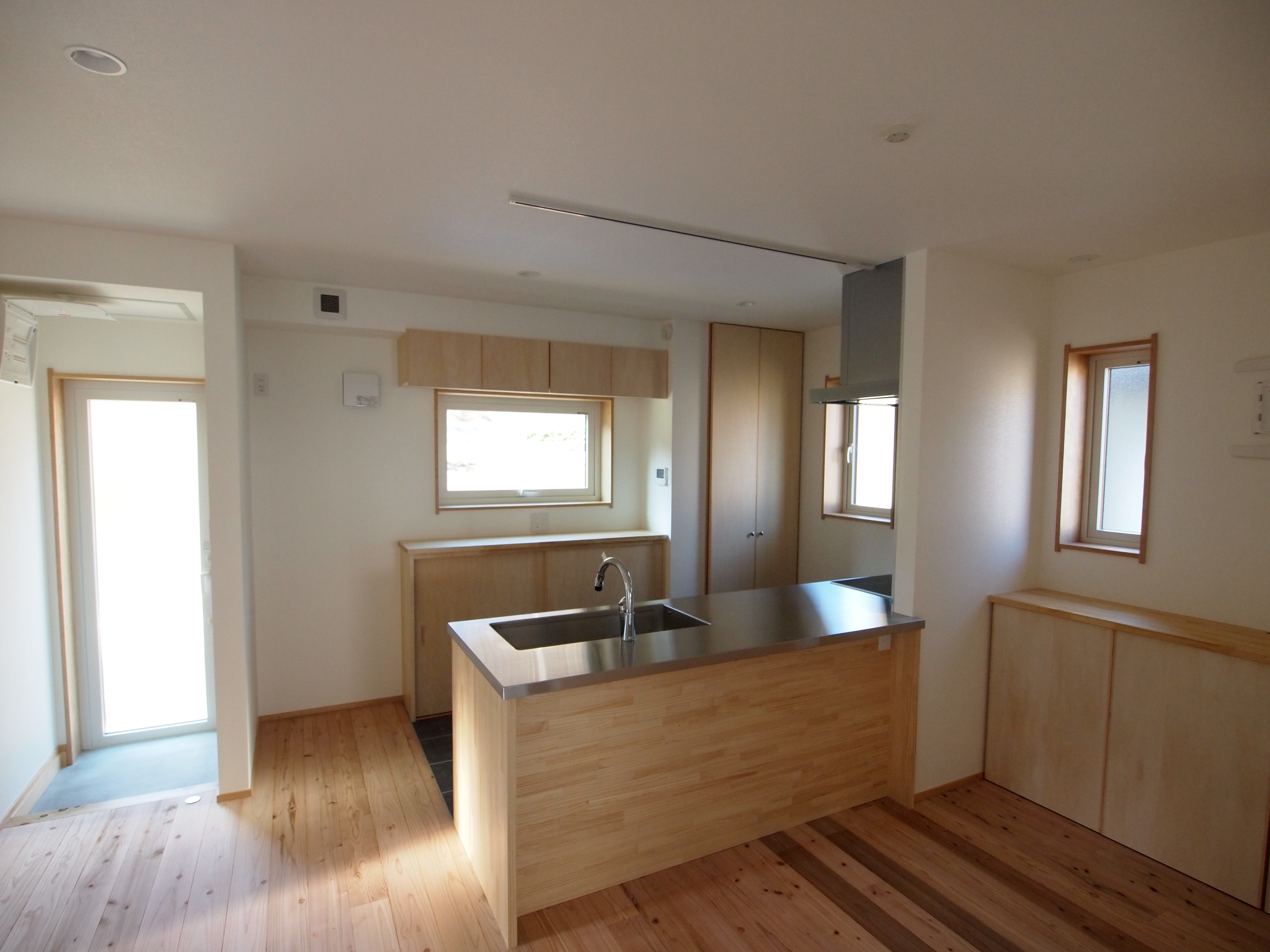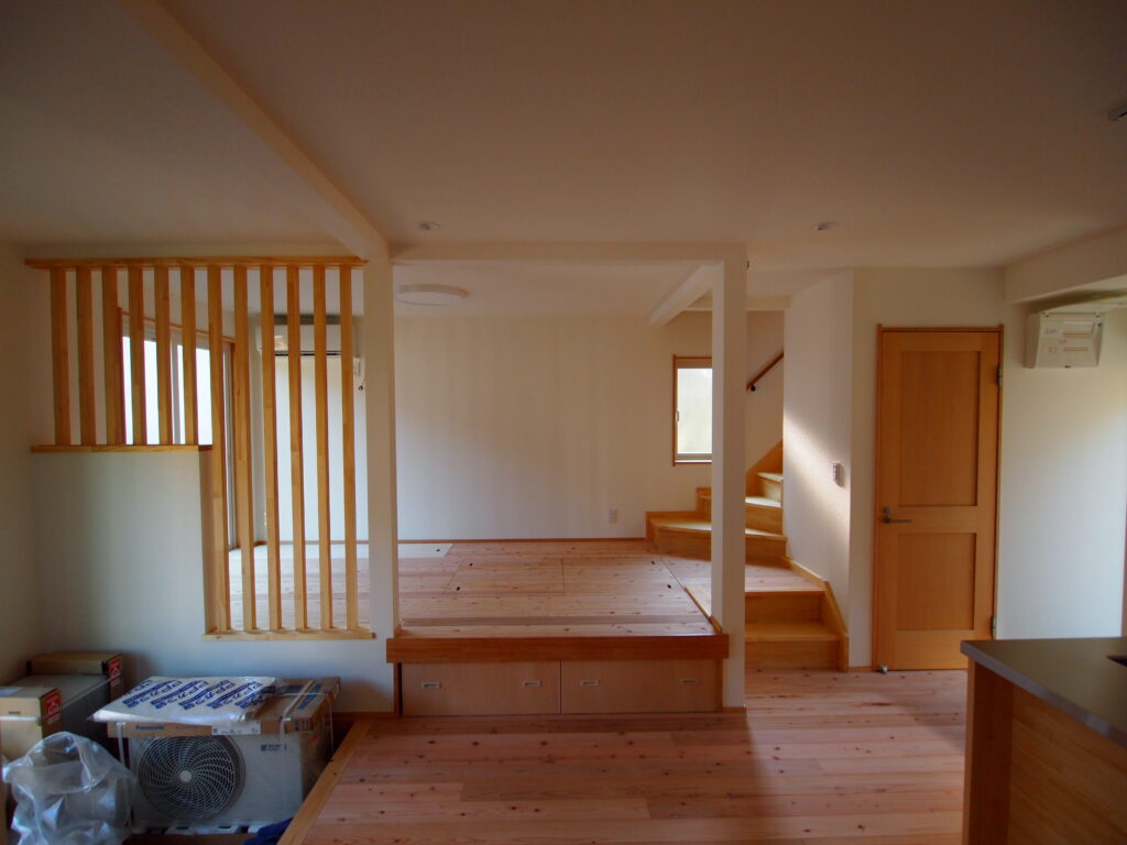 完成です。リビングに小上がり部を設け下を収納にしています。