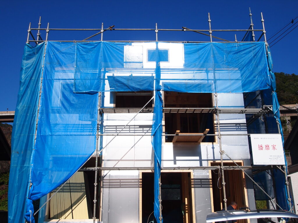外張り断熱材Q1ボードを張り上げました。2X4工法2階建+小屋裏収納です。