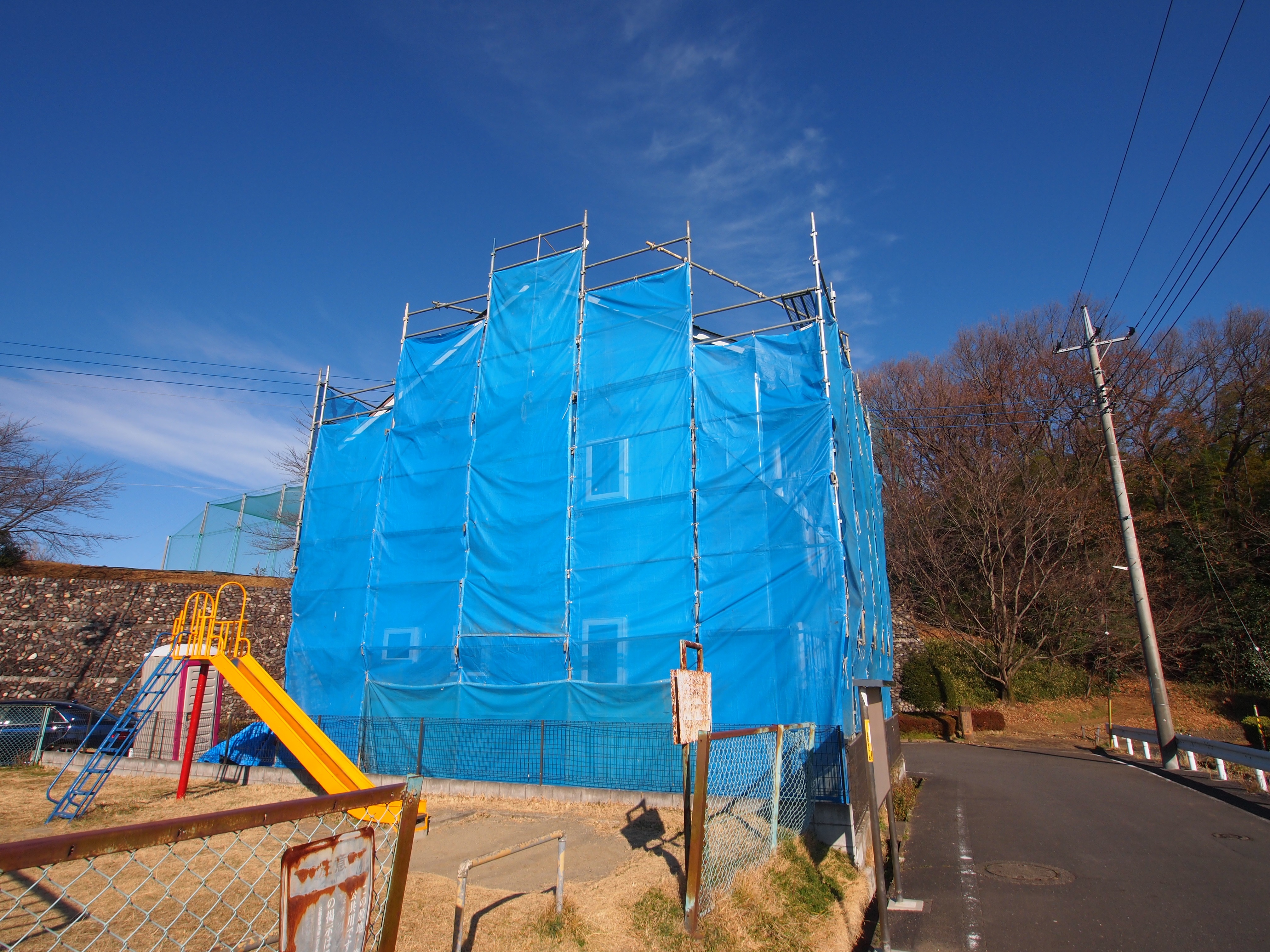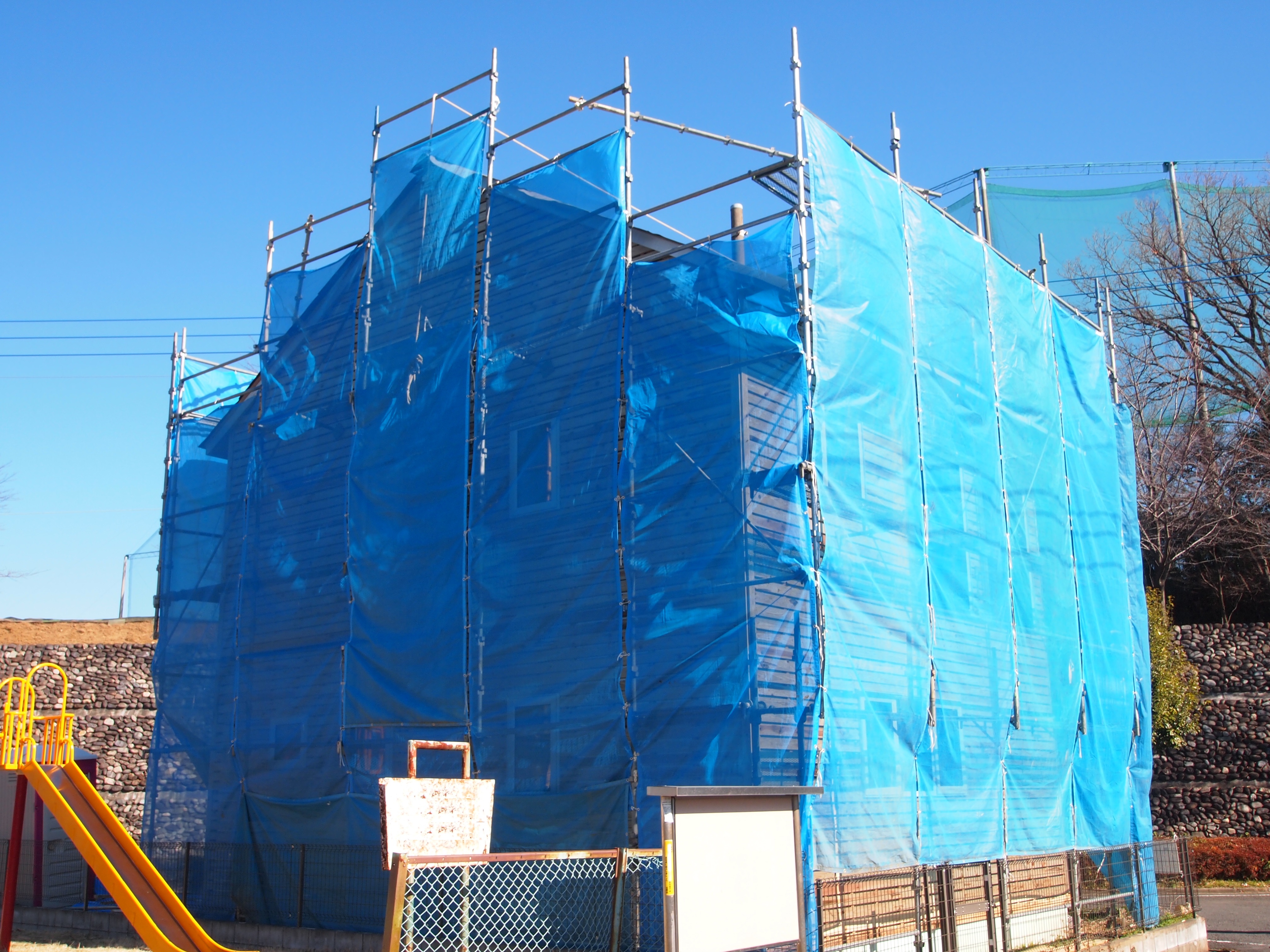 足場外しました。外壁は変色に強く汚れ難いシリケート塗料カイムロイヤラン塗装です。