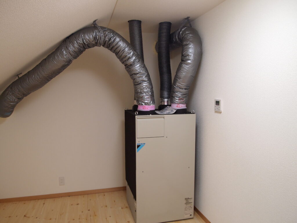 デシカホームエアは3階に設置しました。気密測定までは断熱ダクトは仮り止めにしています。