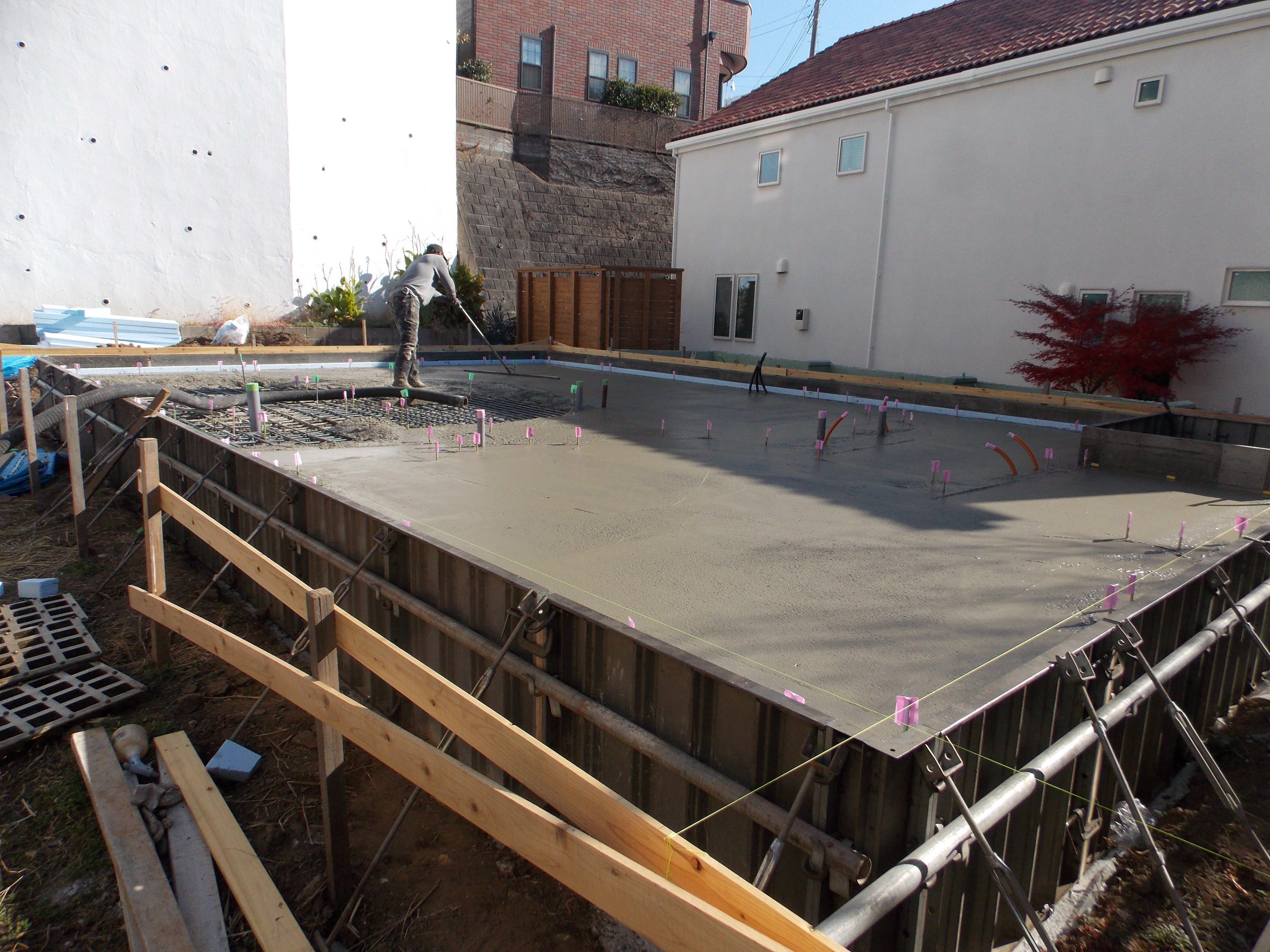 スラブと立上り一体打ち基礎の生コンクリート打設しています。