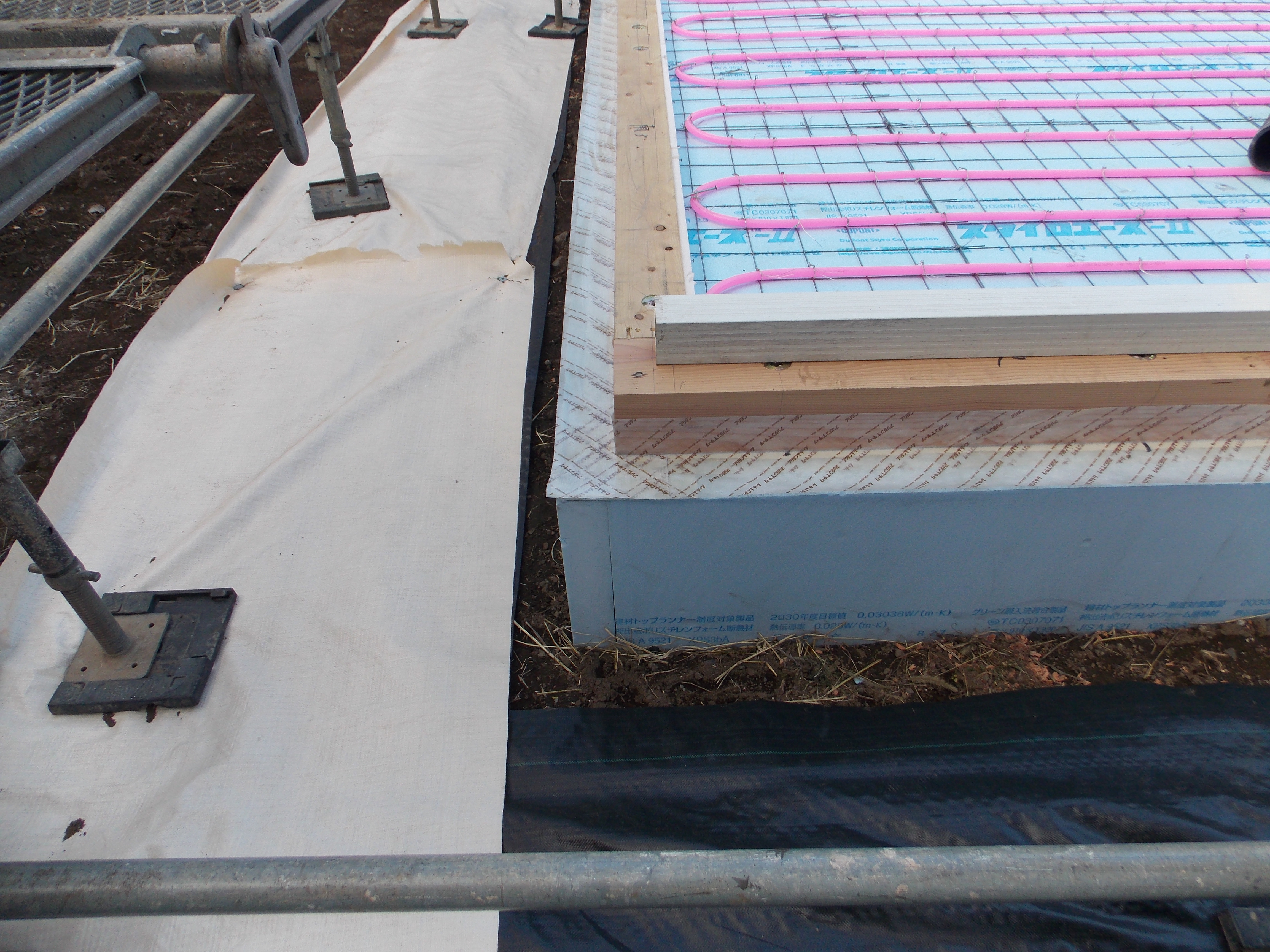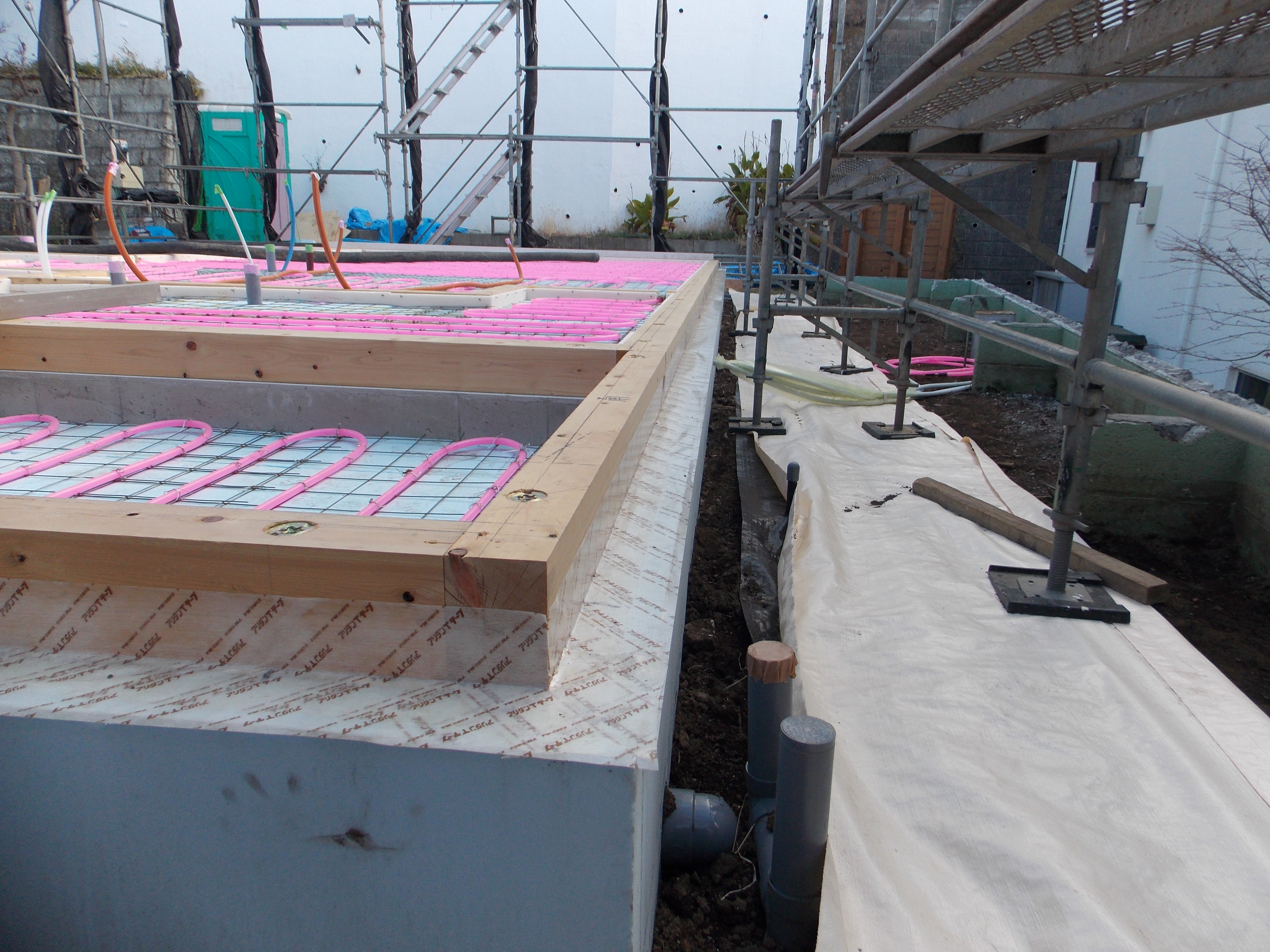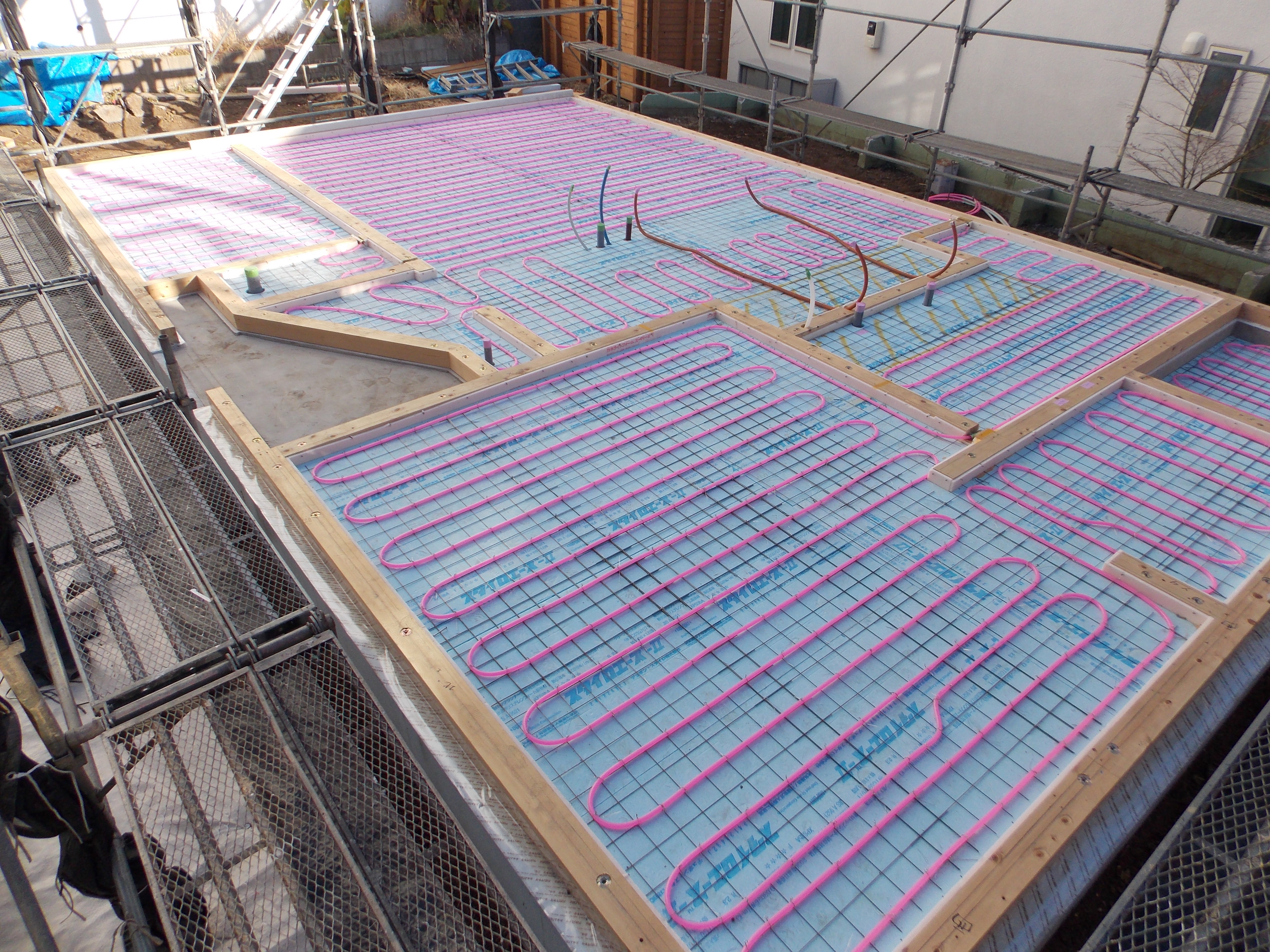 1日、5~6時間の運転で24時間暖かい蓄熱式床暖房の配管を施工しました。