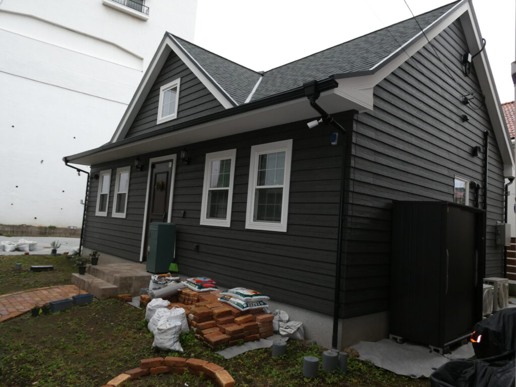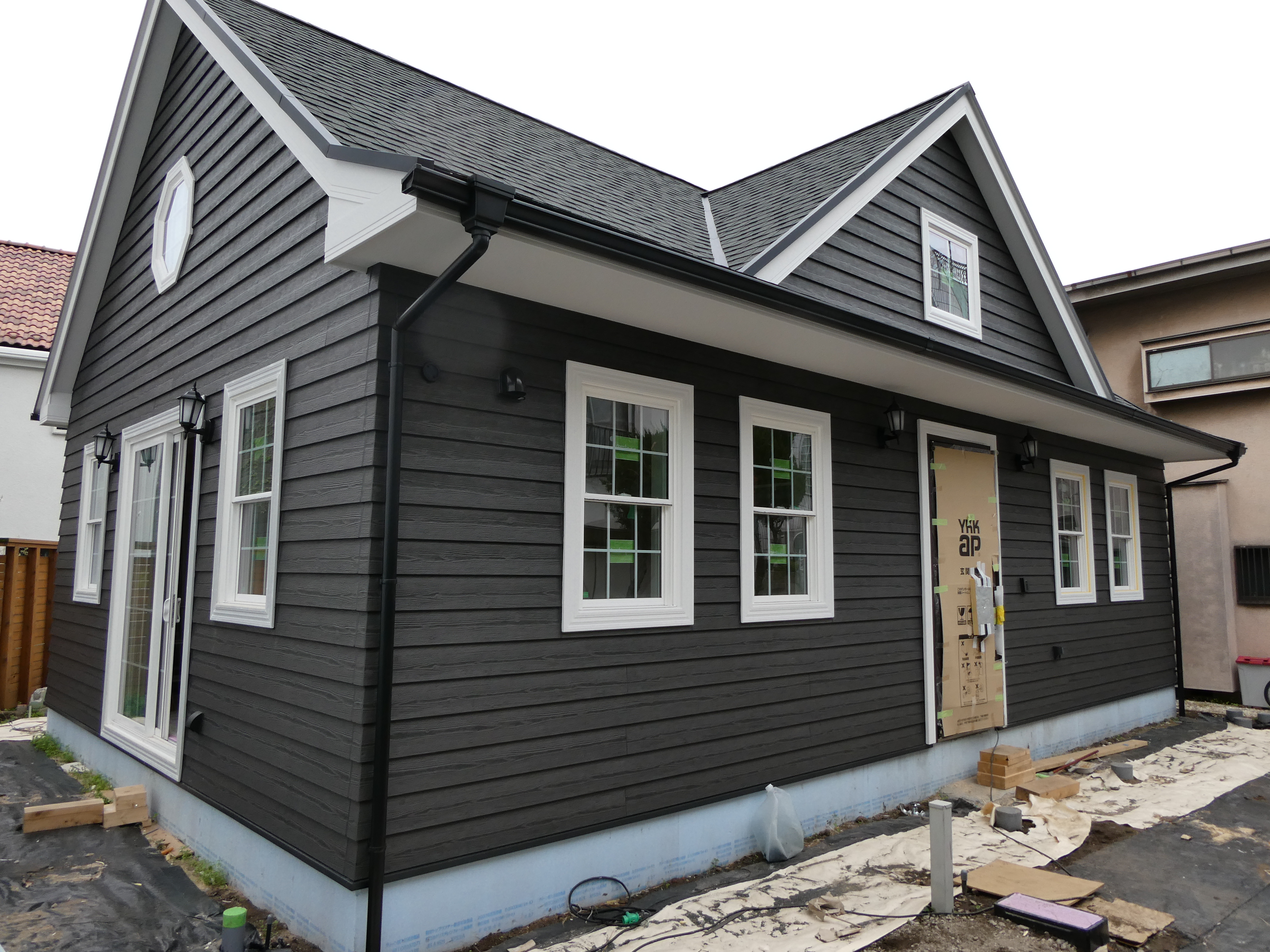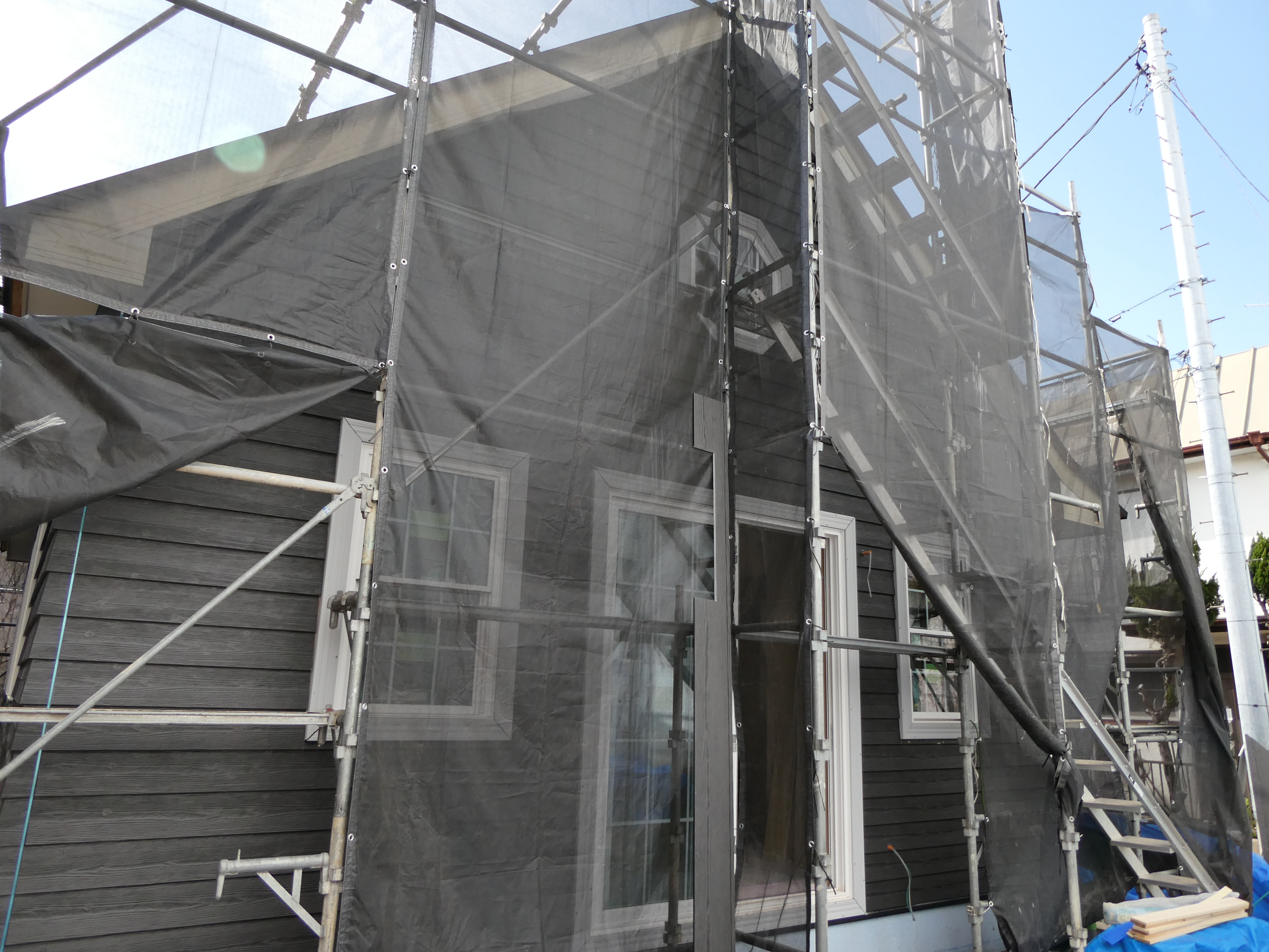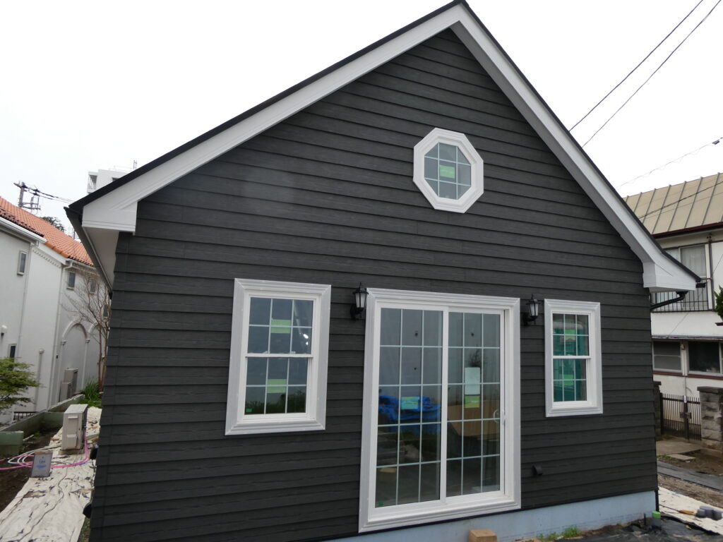 サイディング貼り工事をおこなっています。東レのラップサイディング・シェーブウッドです。
