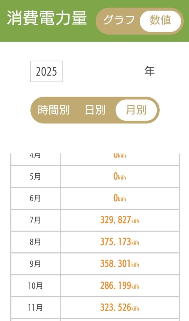 ・太陽光があるので日中は自家消費優先で、電気使用量は気にせずガンガン使用。それでも400kWh以下なので素晴らしい性能を感じています。