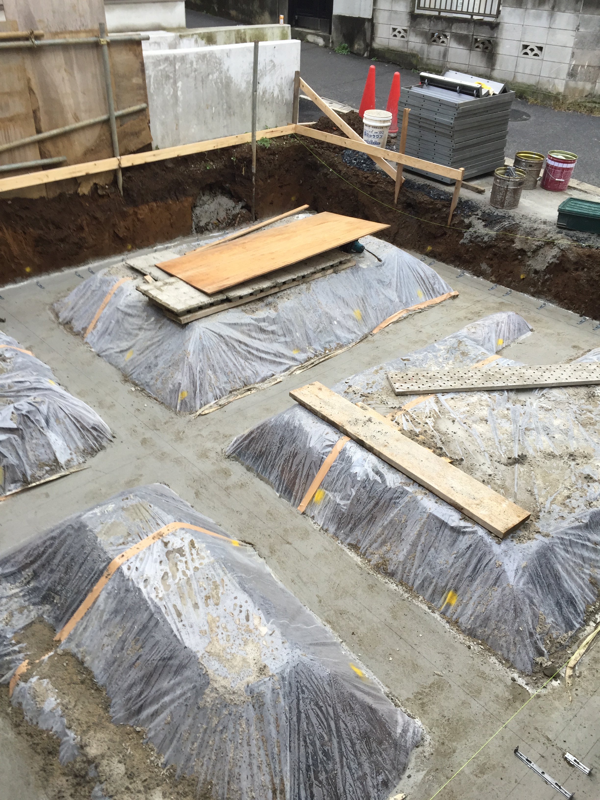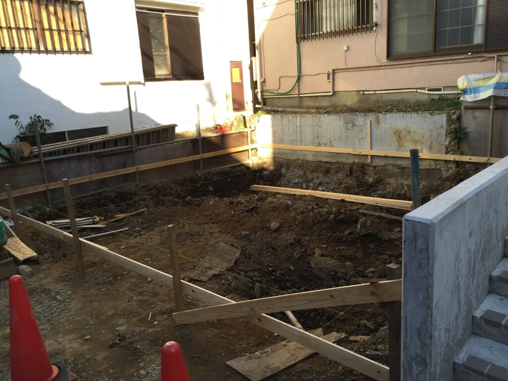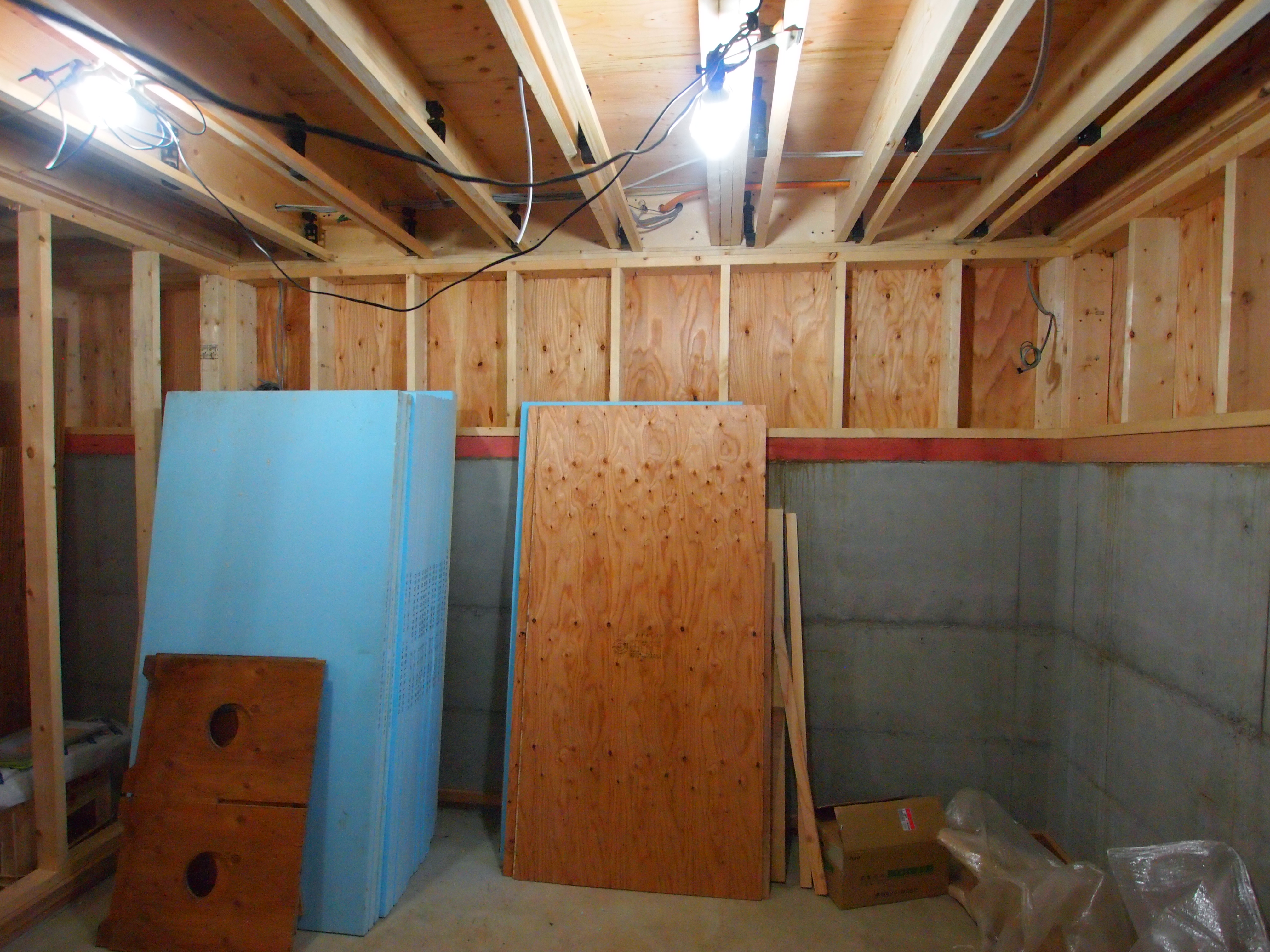 一階の一部は半地下になります。RC壁厚180㎜、スタイロフォームを100㎜外張りで、床壁が蓄熱層となります。