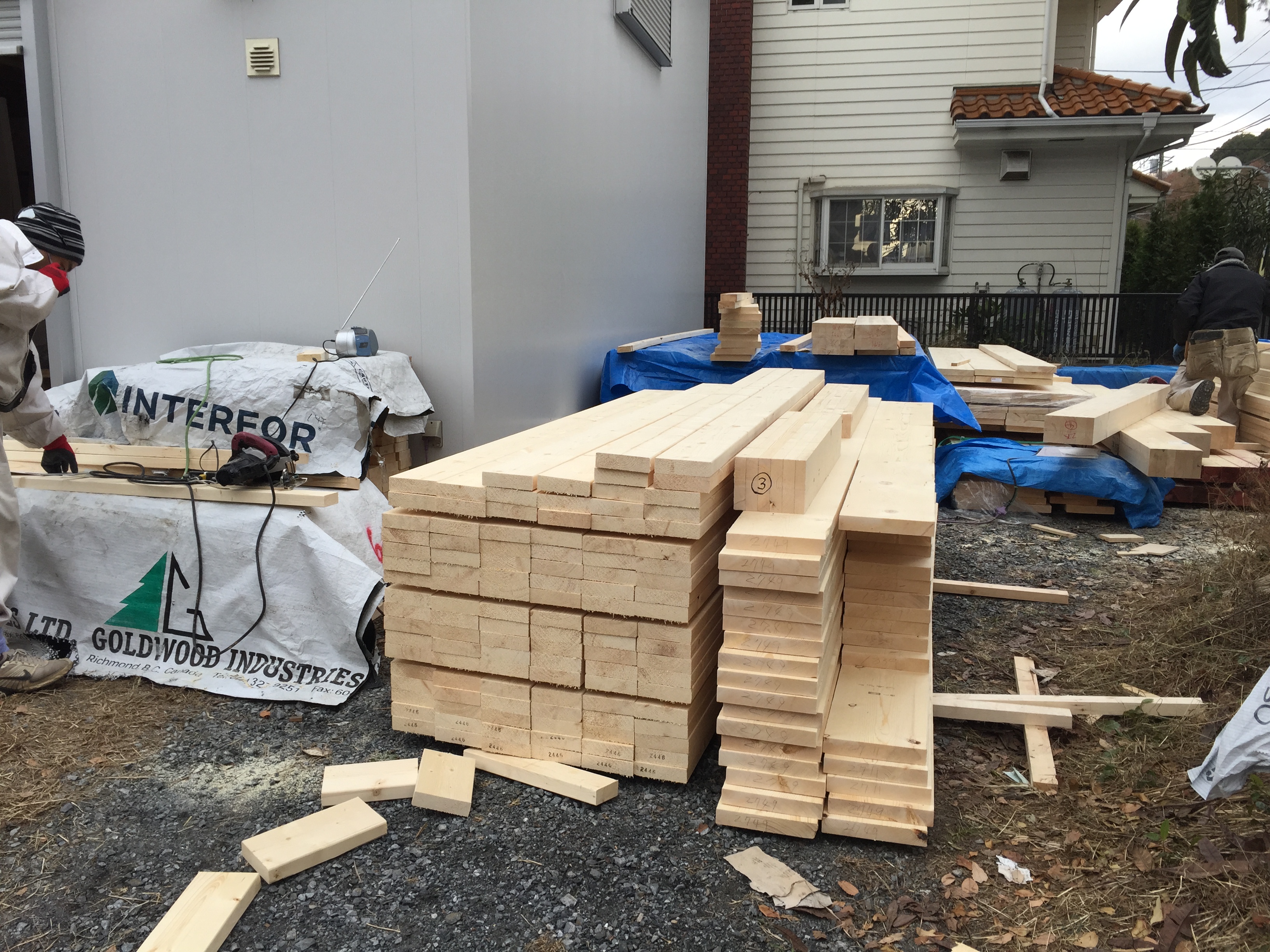 弊社置き場で材料を刻み始めました。2X4工法3階建。