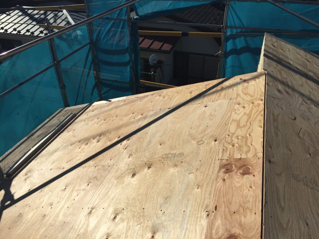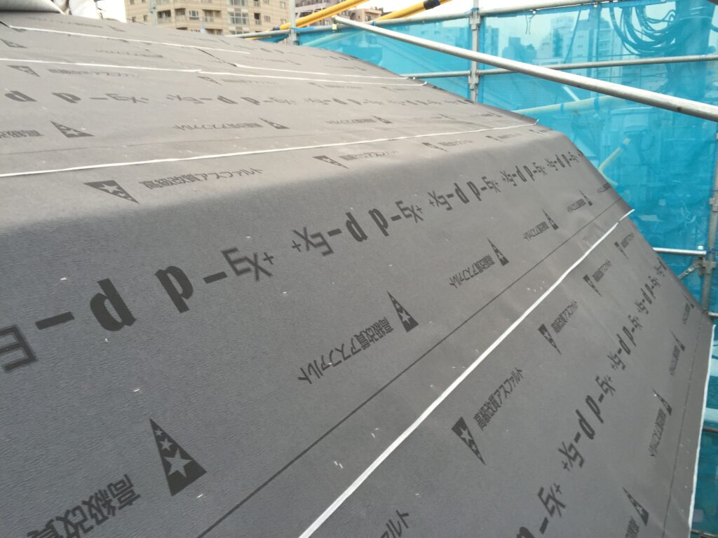 屋根に通気層を設けて二層目の野地板を張り、この上にアスファルトルーフィング(防水シート)を張りました。