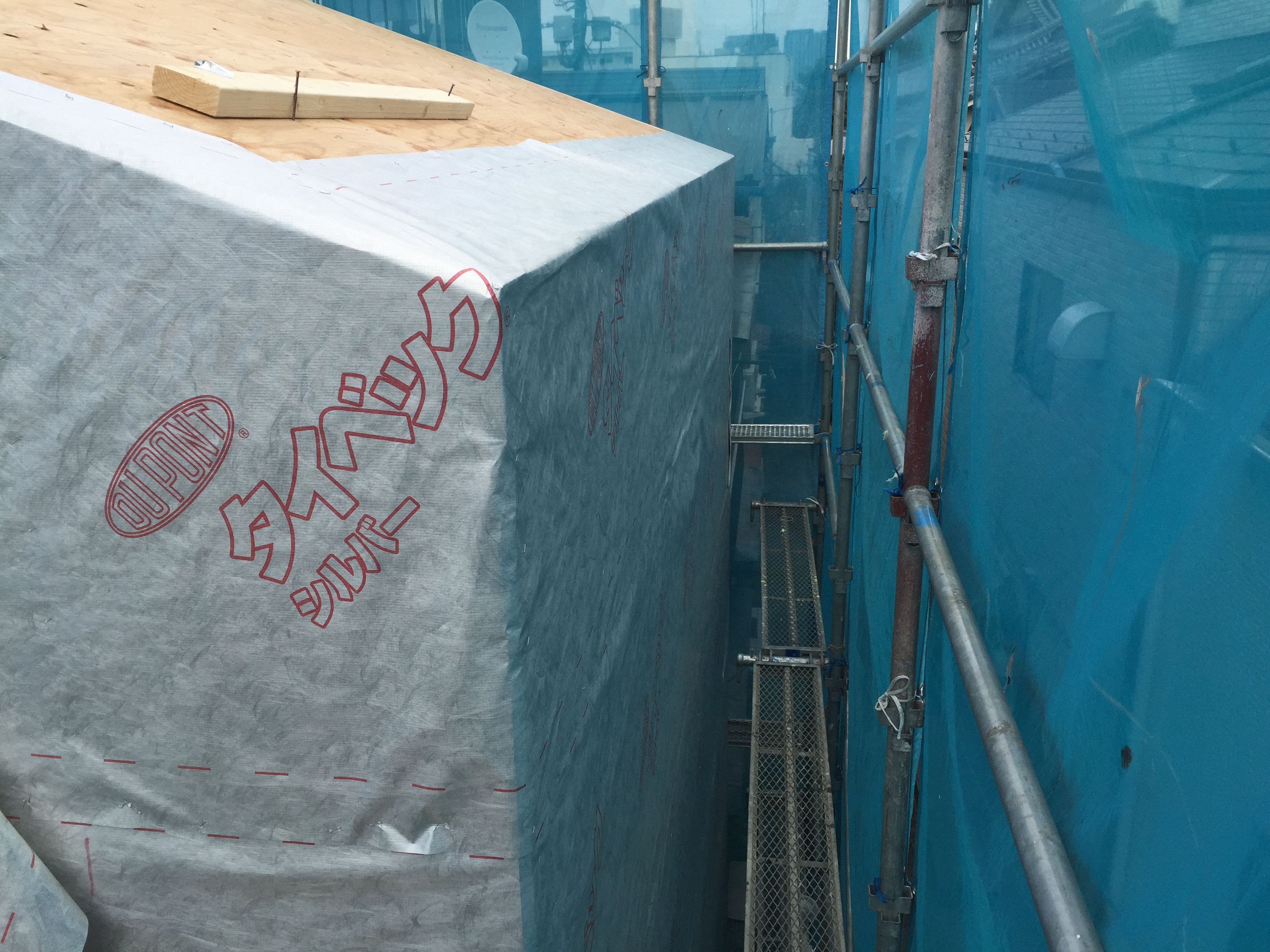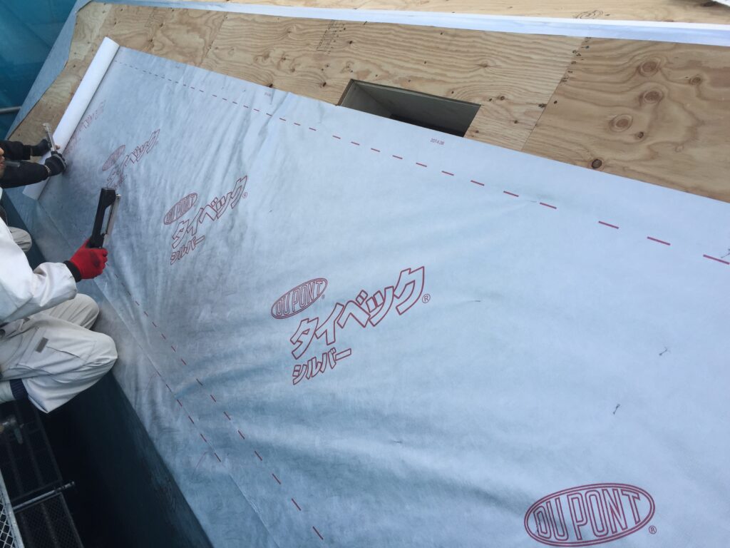外壁・野地板にタイベック シルバー(透湿・防水・遮熱シート)を張りました。