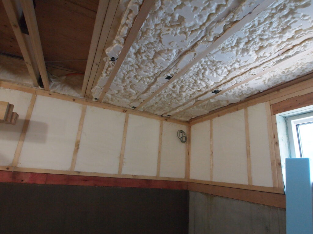 断熱材は現場発泡アイシネン充填断熱です。壁140㎜厚、屋根は180㎜厚です。