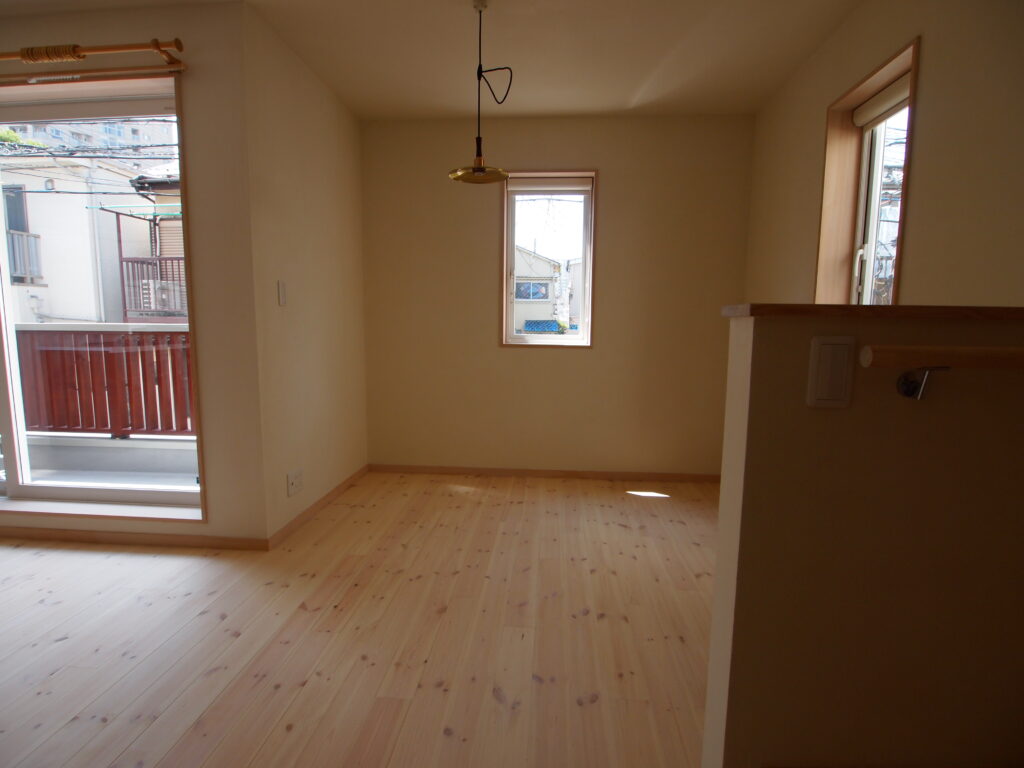 2階リビング、床はパイン無垢フローリング、壁、天井は珪藻土金鏝仕上げです。