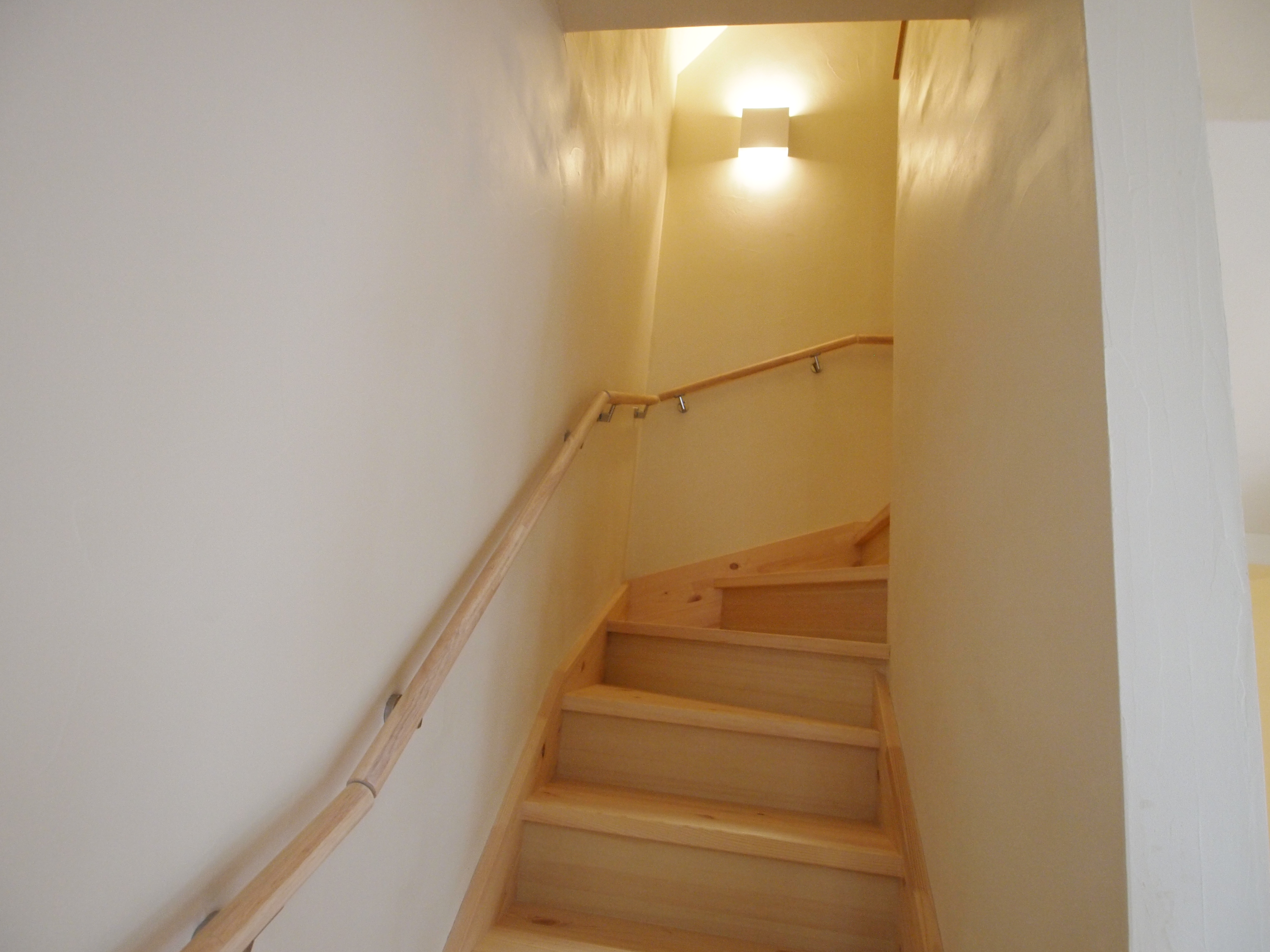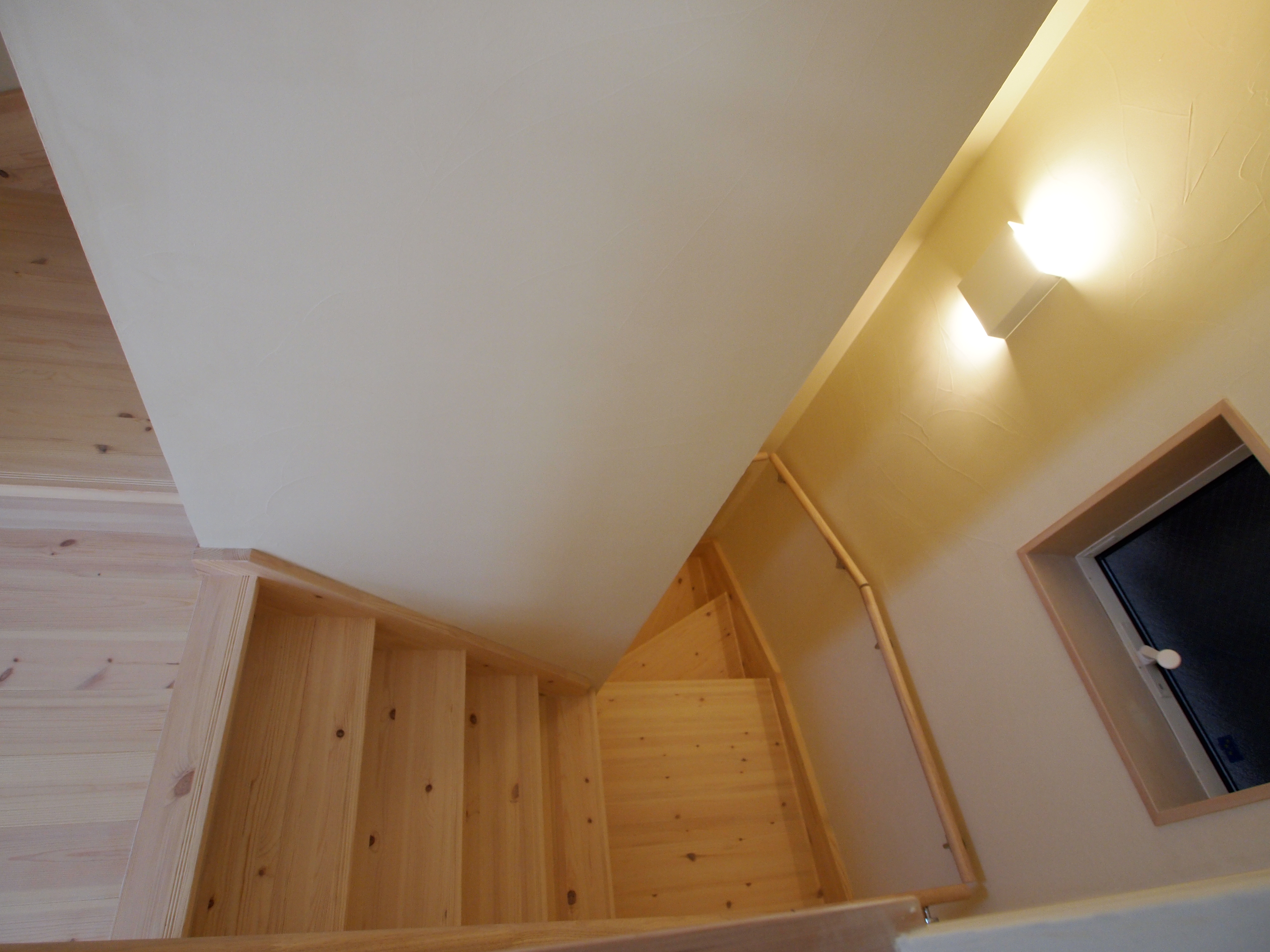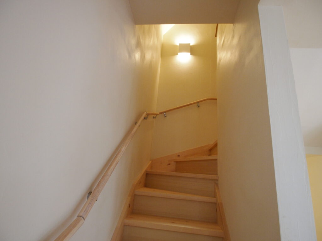 階段材はパイン集成材、壁は珪藻土塗り仕上げです。